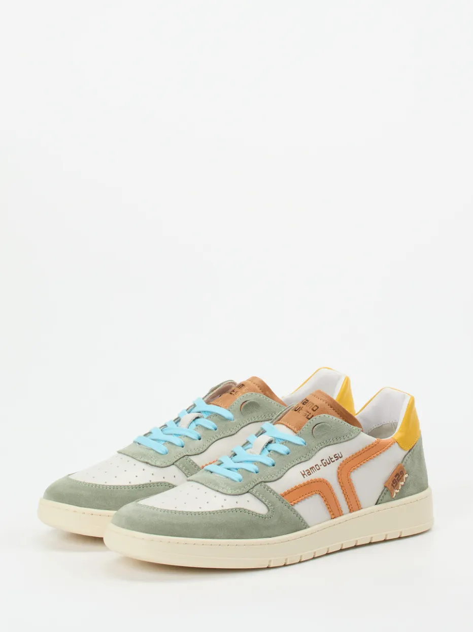 Frühlingsfarben mit Retro-Flair.Der Unisex-Sneaker von Kamo Gutsu überzeugt mit einem Design, das Stil und Komfort vereint. An sonnigen Tagen bietet der Schuh mit seinem gepolsterten, ledergefütterten Innenschuh und einem Wechselfußbett angenehmen Tragekomfort – ideal für Freizeit oder Urlaub. Gefertigt aus weißem Kalbleder mit samtig angeschliffenen Veloursleder-Overlays in Salbeigrün setzt das Modell trendige Akzente. Gelber Fersenpatch, orangefarbene Zackenstreifen und hellblaue Schnürsenkel unterstreichen den pastelligen Color-Blocking-Look. Die flache Gummisohle mit sportlichem Profil sorgt für rutschhemmenden Halt. Kombiniert zu leichten Stoffhosen entfaltet der Sneaker seinen modernen Streetstyle. Ein charakterstarkes Modell mit Liebe zum Detail – typisch Kamo Gutsu.
