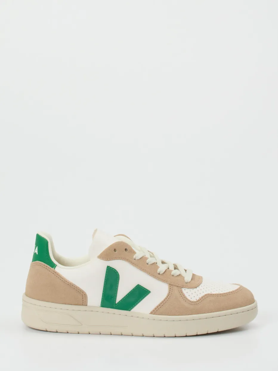 Retro trifft Minimalismus.VEJA präsentiert einen stilbewussten Low-Top-Sneaker für Alltag und Freizeit. Taupefarbenes Wildleder in Kombination mit weißem Kalbleder verleiht diesem Modell eine hochwertige Haptik und dezente Eleganz. Die beige-weiße Optik wird kontrastiert durch das grüne Logo-Overlay und einen strukturierten, perforierten Vorderfußbereich. Die klassisch runde Silhouette, gepolsterte Ferse und die gummierte Naturkautschuksohle bieten hohen Komfort und urbanen Appeal. Dieses Design lässt sich mühelos mit Casual Shorts oder cleanen Streetwear-Looks kombinieren. Nachhaltiges Design mit klarer Formsprache – typisch VEJA.