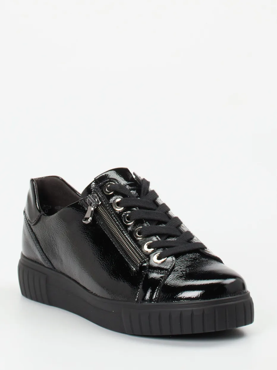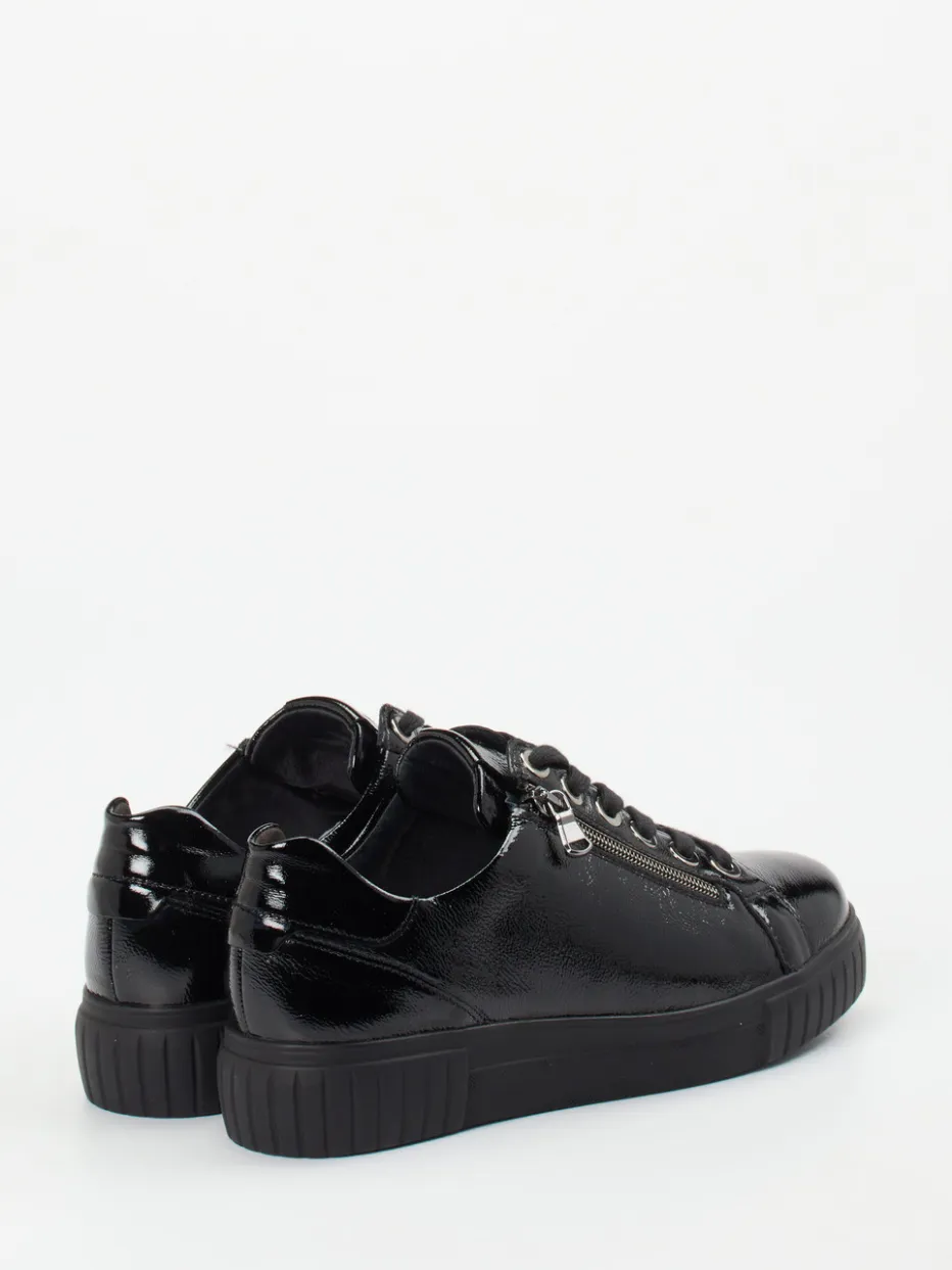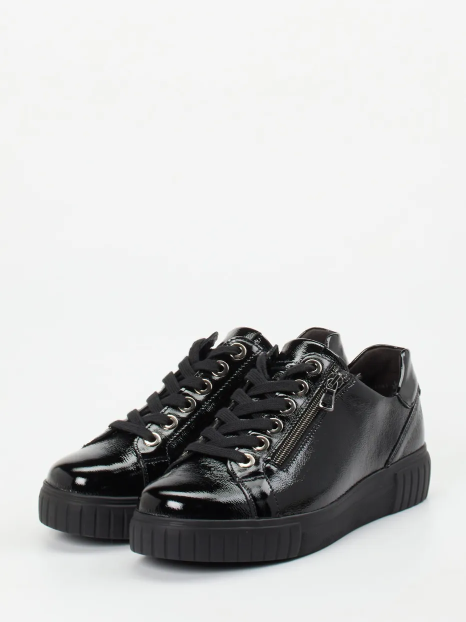 Glanz trifft Alltagstauglichkeit.Semler präsentiert einen modischen Damen-Sneaker aus der Linie Pippa. Für Tage, an denen Komfort und Stil gleichermaßen gefragt sind, bietet dieses Modell aus hochwertigem Lackleder mit glänzender Oberfläche eine stilvolle Lösung. Die schwarze Farbe unterstreicht den minimalistischen Look, während die klassische, rund geformte Silhouette und silberfarbene Metall-Details wie Reißverschluss und Ösen raffinierte Akzente setzen. Der seitliche Reißverschluss erlaubt schnelles Anziehen, das gepolsterte Fußbett sorgt für Bequemlichkeit – auch bei langen Tagen. Ideal kombinierbar mit Monochrom-Outfits oder Business-Casual-Looks. Semler-typischer Gehkomfort trifft auf urban inspirierte Eleganz.