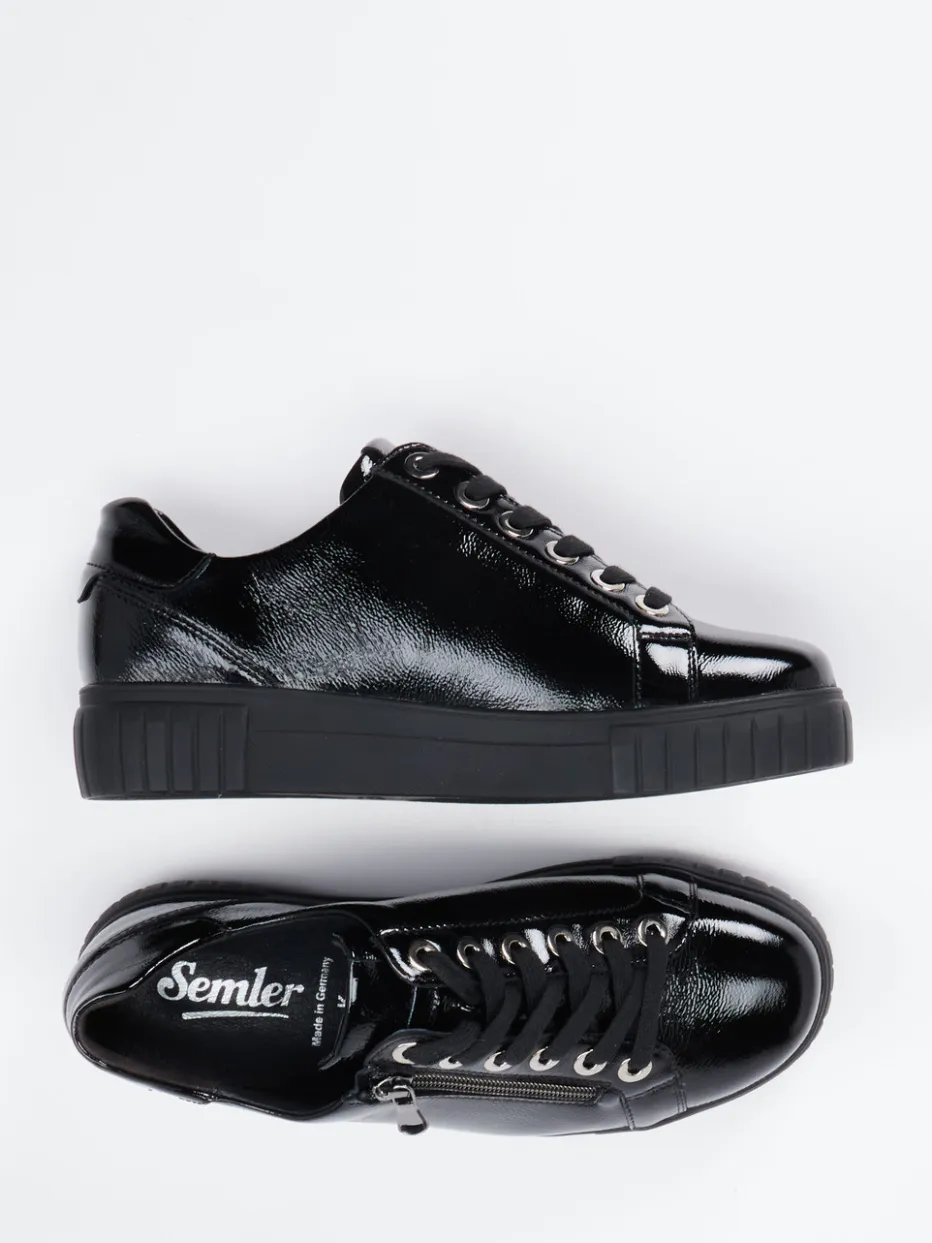 Der glänzende Lackleder-Sneaker von Semler kombiniert urbanen Chic mit funktionalem Komfort – ideal für stilbewusste Alltagslooks.