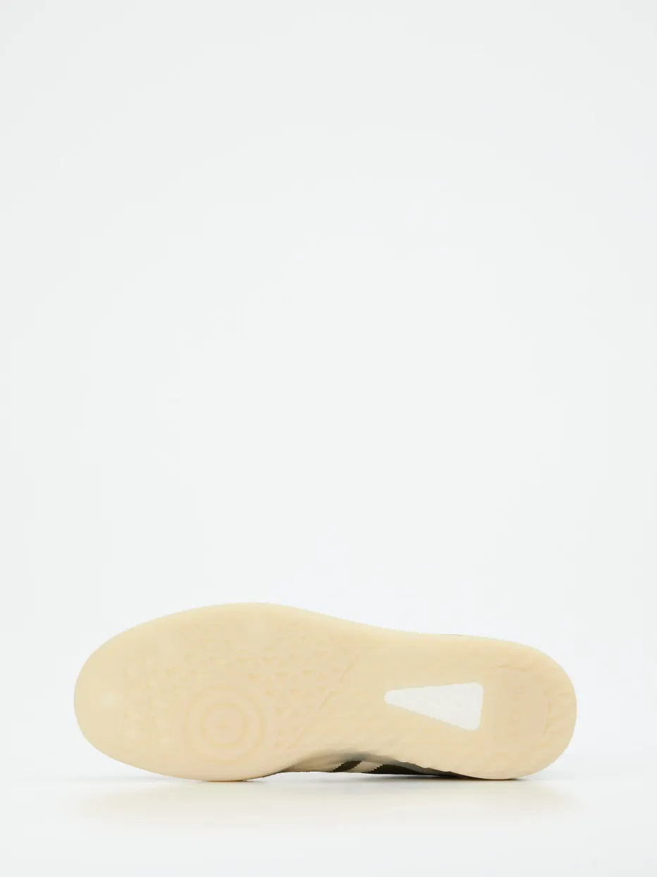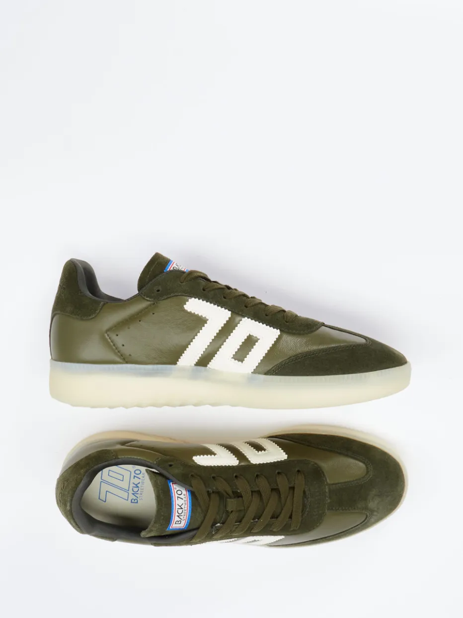 Vintage-Charme neu interpretiert.Back 70 präsentiert mit diesem Retro-Sneaker ein stilvolles Modell für Alltag und Freizeit. Die flache, runde Silhouette in moosgrünem Lammleder mit samtig strukturierten Veloursleder-Akzenten harmoniert ideal mit weißen Glattleder-Overlays. Das markante 70s-Logo auf der Zunge sowie das seitliche Branding stärken die nostalgische Aussagekraft. Atmungsaktives Innenfutter und Wechselfußbett sorgen dabei für modernen Komfort, während die profilierte, leicht transluzente Gummisohle an Streetwear-Styles erinnert. Inspiriert von Retro-Football-Ästhetiken und „Quiet Sportswear“-Trends fügt sich das Modell perfekt in trendorientierte Looks ein. Authentisches Design mit funktionalem Anspruch – typisch Back 70.