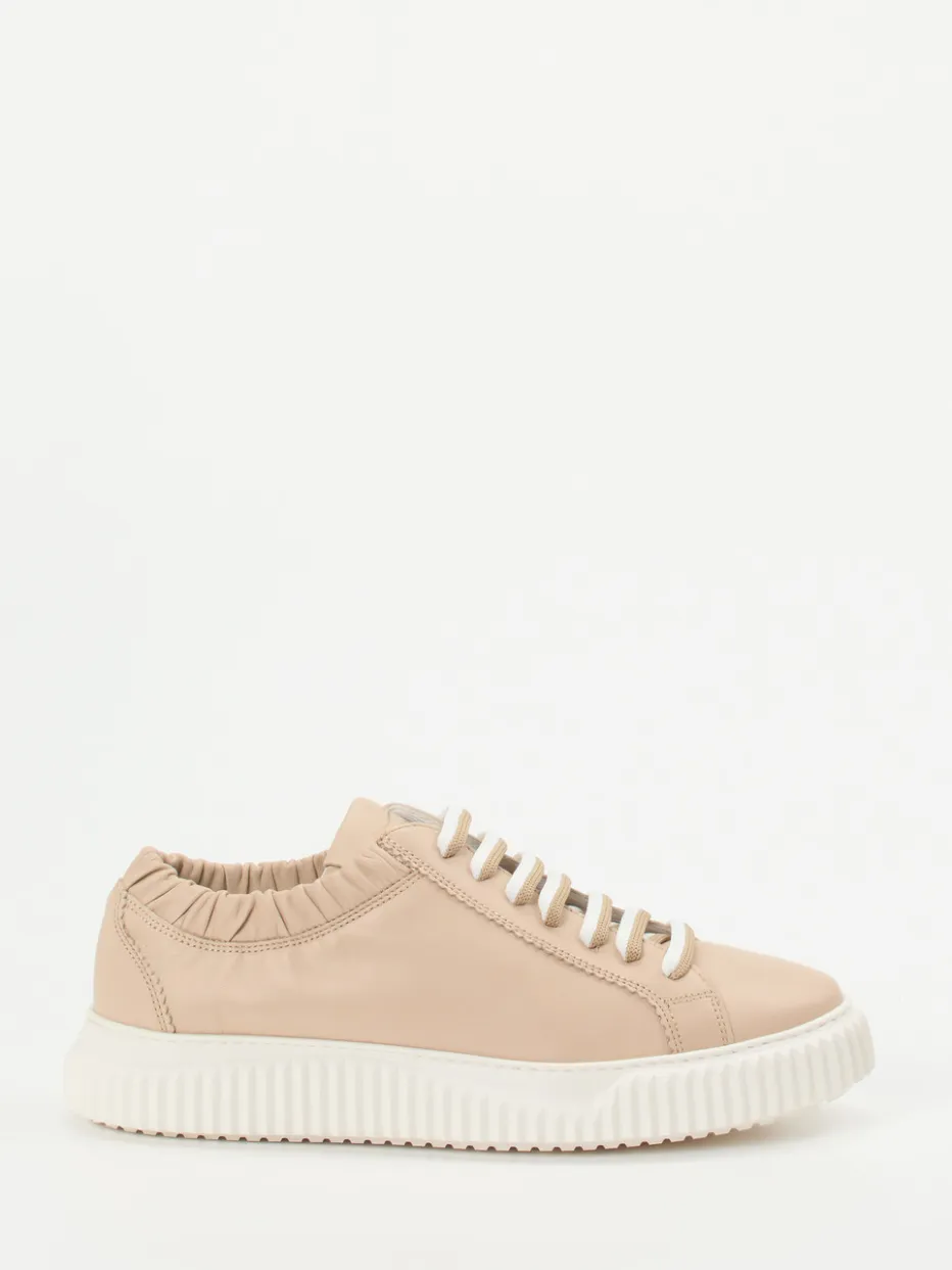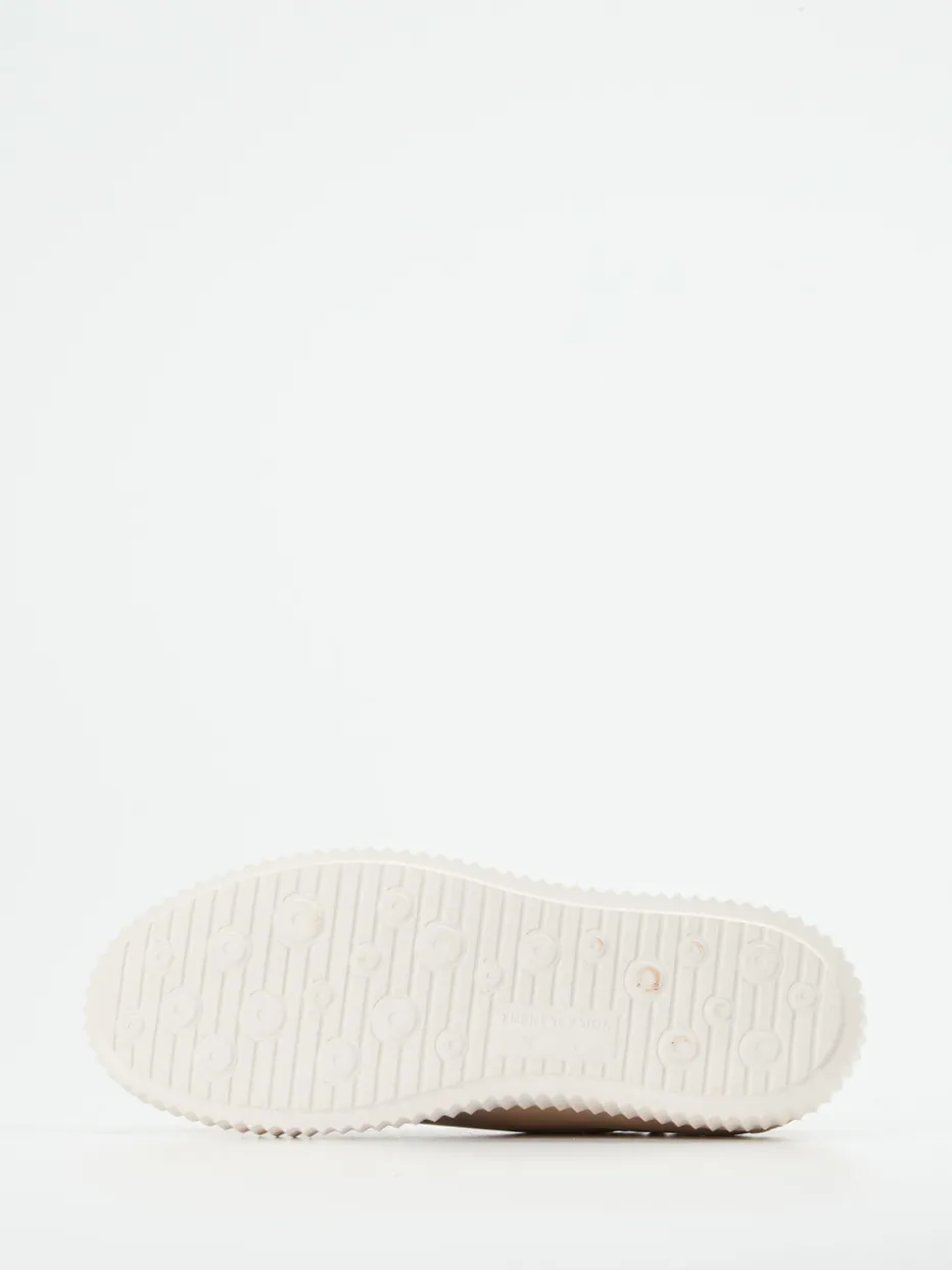 Ob beim Stadtbummel oder im Homeoffice – das nudefarbene Lammleder mit glatter, matter Oberfläche sorgt für ein dezentes Statement. Der elastische Schaftrand und die gepolsterte Wechselsohle ermöglichen ein komfortables Tragegefühl, ergänzt durch eine markante, weiß profilierte Gummisohle mit gezacktem Rand. Die Ton-in-Ton-Nähte und der klassische Schnitt unterstreichen den minimalistischen Streetwear-Einfluss. Optimal kombinierbar mit Beige-Tönen oder leichten Materialien – ideal für Frühjahrslooks im dezenten Stil.