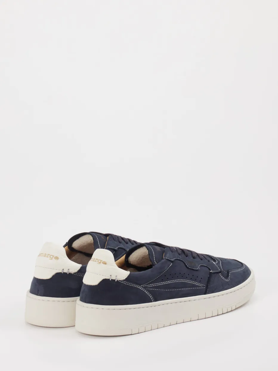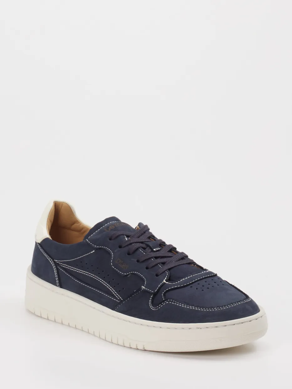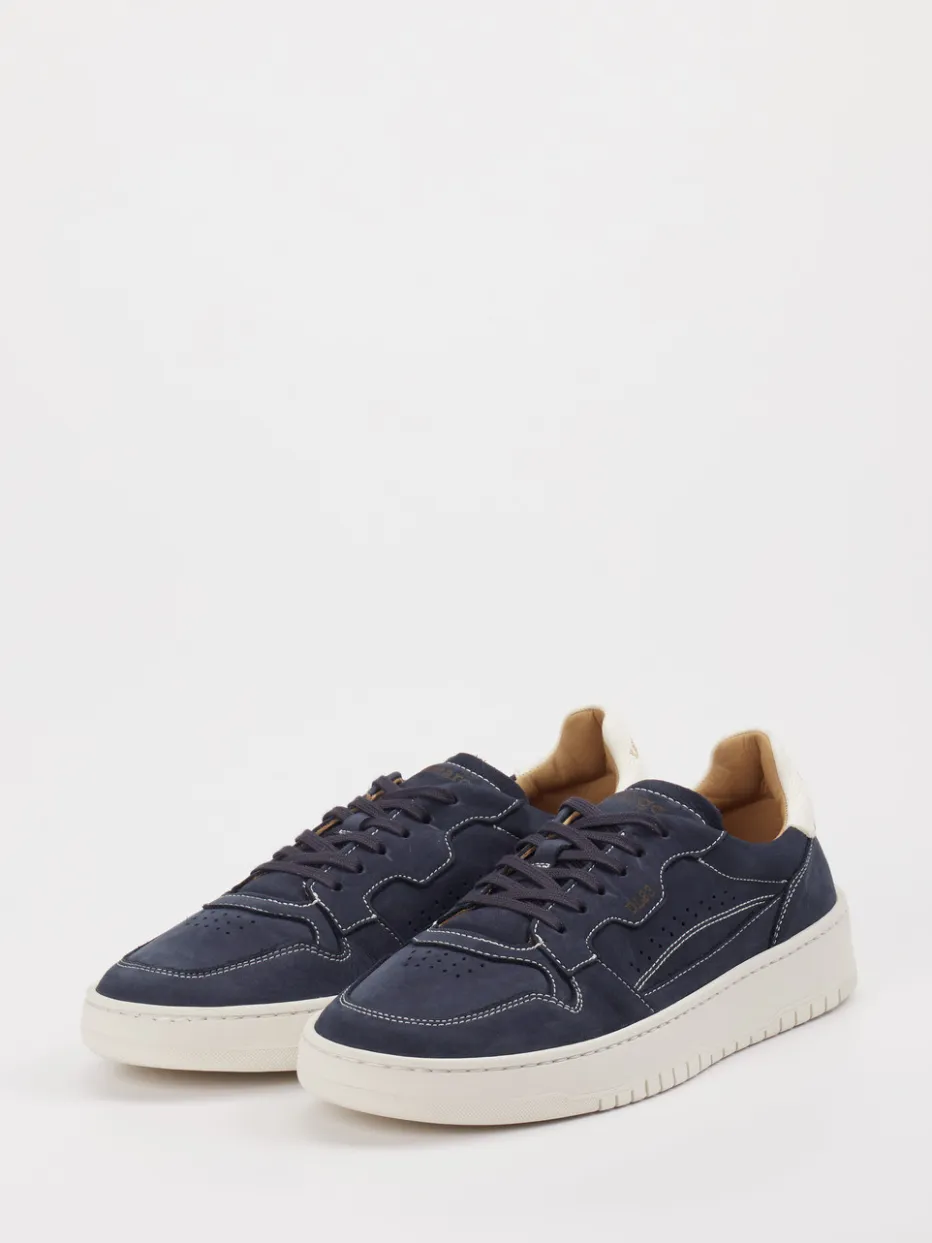Ob beim Stadtbummel oder entspannten Café-Besuch – das fein strukturierte Nubukleder in Dunkelblau bietet angenehmen Tragekomfort und einen souveränen Auftritt. Die klassische, flache Form ist von Retro-Sneakern inspiriert, während weiße Kontrastnähte, eine cremefarbene Fersenkappe und dezente Logo-Prägungen markante Details setzen. Der Schnürverschluss sorgt für sicheren Halt, die dicke Gummisohle mit Basketball-Profil für Trittsicherheit und Komfort. Modern interpretiert im Color-Blocking-Trend und ideal zu Chino oder Denim.