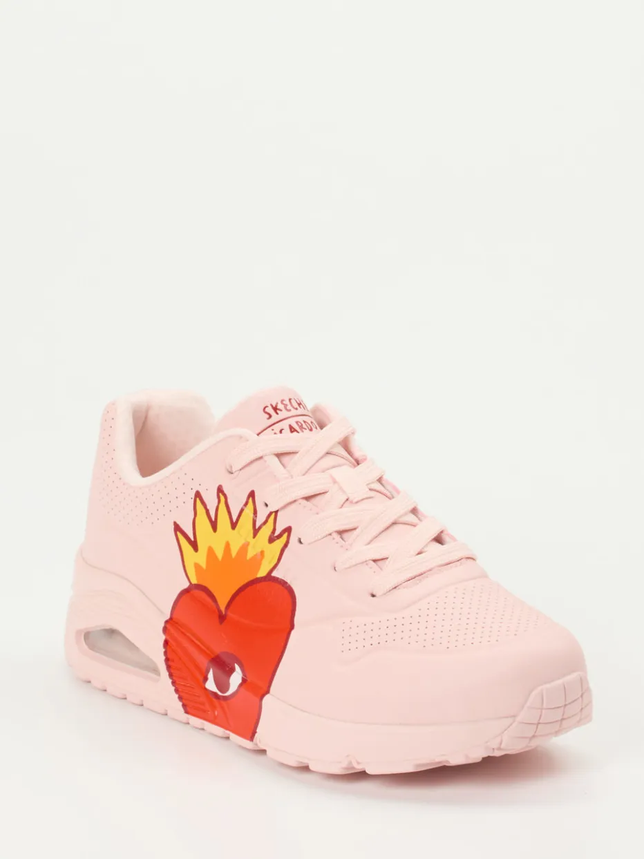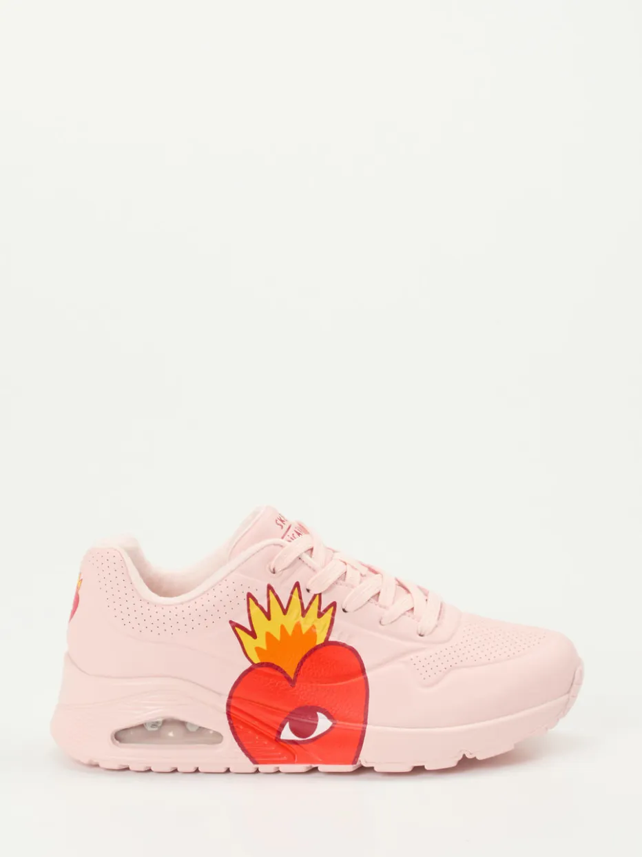 Ob beim City-Bummel oder auf Events – dieser Sneaker vereint Komfort mit pop-artiger Individualität. Glattes Leder trifft auf eine matte Oberfläche und ein auffälliges Herz-Flammen-Motiv des Künstlers Ricardo Cavolo. Das Design auf pastellrosafarbenem Grund erhält durch orange-rote Akzente besondere Tiefe. Luftpolster an der Ferse sowie eine perforierte Zehenbox sorgen für Tragekomfort und Atmungsaktivität. Die tonale Gummisohle unterstützt den sportlich-klassischen Schnitt, während die Streetwear-Ästhetik echte Statement-Qualitäten bietet. Styling-Tipp: Lässig mit pastellfarbenen Socken und Mini-Rucksack kombinieren.