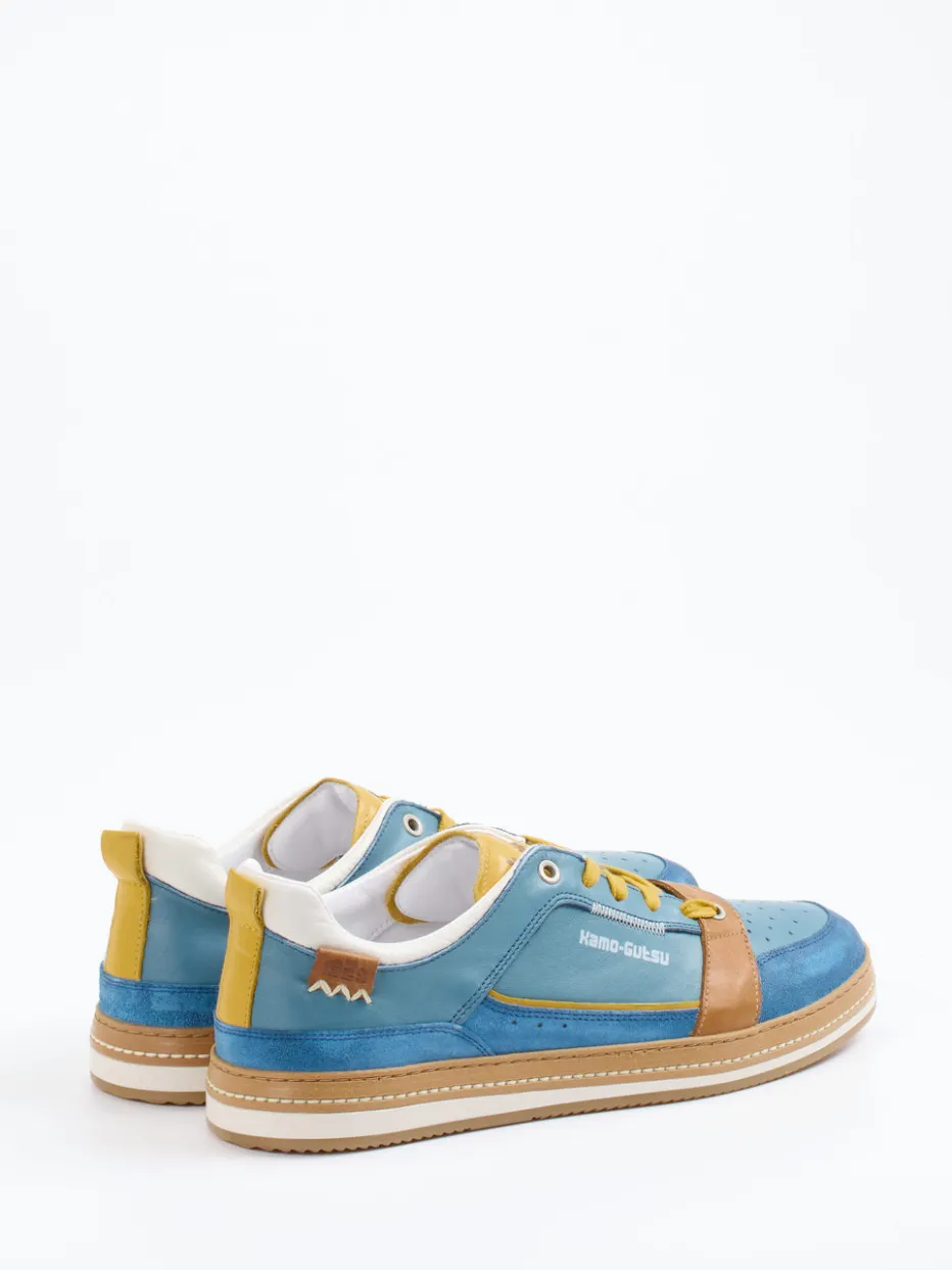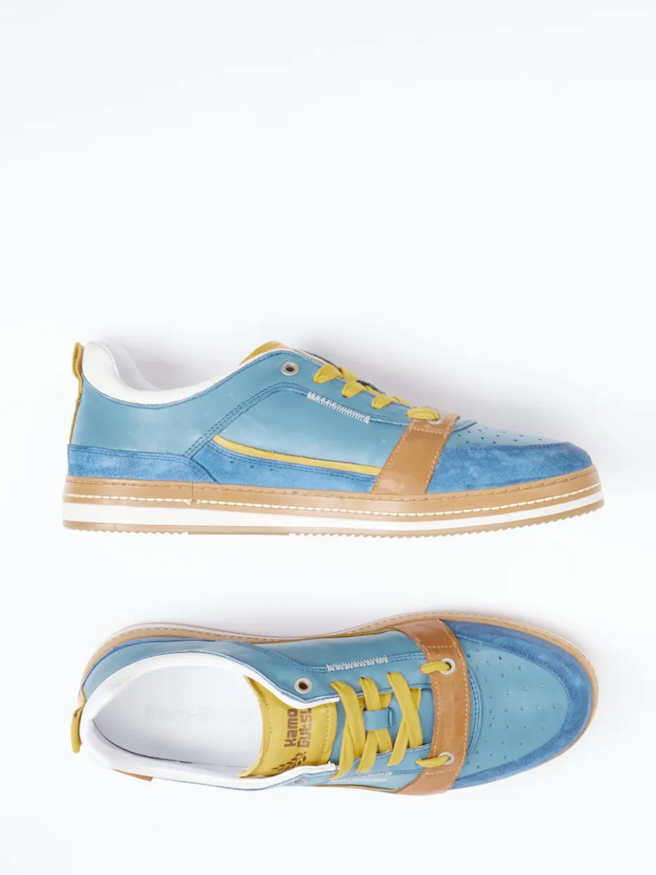 Retro trifft Farbe.Kamo Gutsu präsentiert mit diesem Low-Top-Sneaker ein auffälliges Freizeitschuhmodell für modisch Anspruchsvolle. Ideal für urbane Alltagslooks verbindet der Sneaker glattes und samtig angeschliffenes Veloursleder in Petrolblau mit Einsätzen in Cognacbraun und leuchtendem Gelb. Die klassische flache Silhouette mit Schnürung und Fersenzuglasche sorgt für eine sportiv-lässige Note. Eine profilierte Gummisohle bietet Grip, während ein herausnehmbares, gepolstertes Fußbett und eine perforierte Zehenbox für Komfort und Belüftung stehen. Vom Color-Blocking der SS25 inspiriert, passt er perfekt zu expressiven Streetwear-Outfits. Ein stilvolles Statement mit Komfortfaktor und authentischer Retro-Ästhetik.