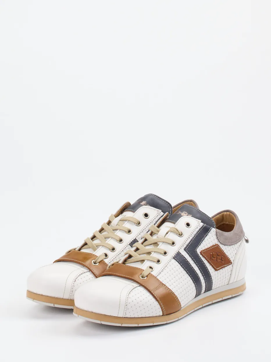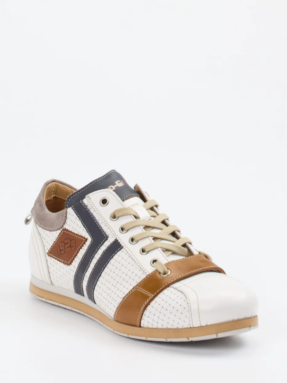 Ideal für entspannte Alltagsmomente verbindet dieser Low-Top-Sneaker weißes Glattleder mit samtig angeschliffenen Velourslederbesätzen in Cognacbraun und Dunkelblau. Die Flechtoptik verleiht ihm eine individuelle Note im Retro-Stil, während die klassische Silhouette, die Schnürung und ein gepolsterter Fersenbereich Bequemlichkeit sichern. Die Gummisohle sowie das ledergefütterte Wechselfußbett bieten angenehme Trageeigenschaften. Inspiriert von Vintage-Sportswear ist dieses Modell ein vielseitiges Stil-Statement – etwa zu Chinos oder Hoodie.