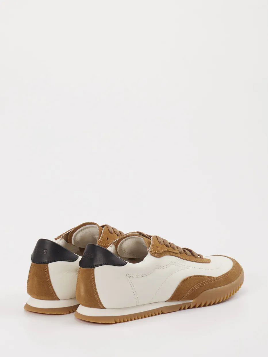 Vielseitiger Klassiker in Retro-Optik. Der Sneaker von Boss vereint sportlich-elegante Linienführung mit hochwertigem Materialmix. Ob auf dem Weg ins Büro oder beim abendlichen Stadtbummel: Der markante Retro Runner aus Velours- und Glattleder überzeugt durch seine harmonische Farbkombination aus Offwhite, Cognac und Schwarz. Die leicht zulaufende Silhouette wirkt dynamisch, während die profilierte Gummisohle zuverlässigen Halt gibt. Schwarze Fersendetails und Ton-in-Ton-Nähte sorgen für stilistische Tiefe. Kombinierbar zu Jeans oder Chino – ideal für Liebhaber minimalistischer Designs im Vintage-Stil. Eleganz und Komfort im sportiven Look – typisch Boss.