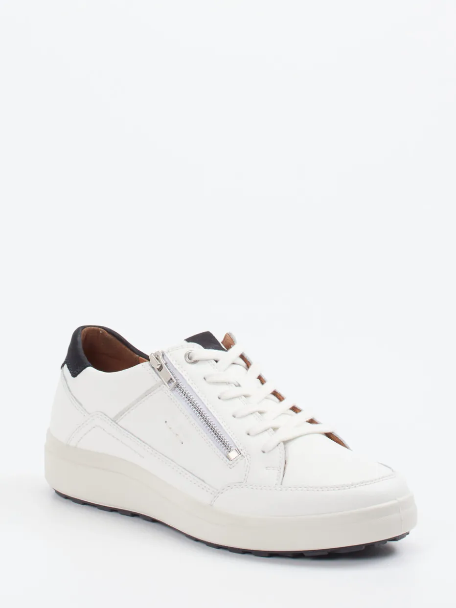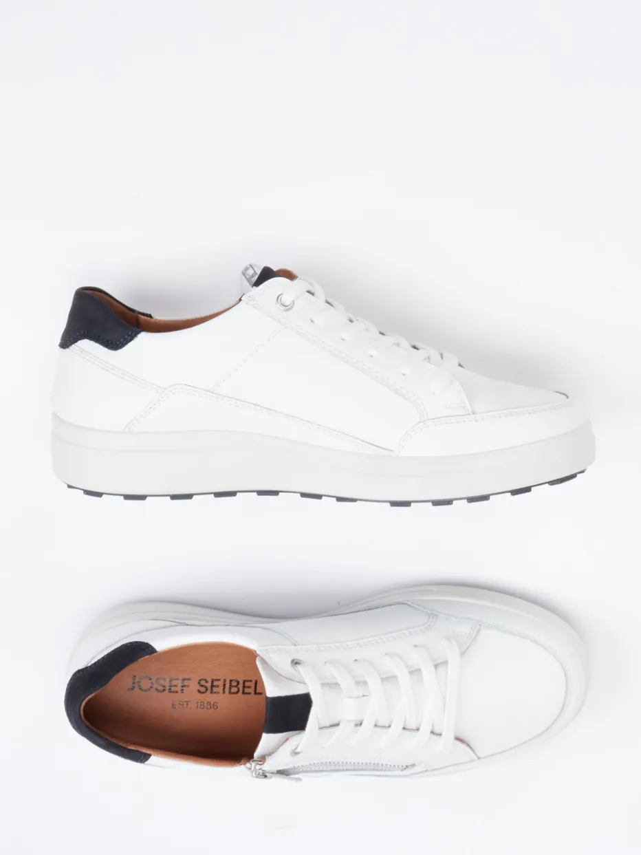 Vielseitiger Komfort im urbanen Stil.Josef Seibel präsentiert mit diesen Sneakern aus weißem Leder einen Schuh für Alltag und Büro. Das matte Glattleder trifft auf eine klassisch-runde Silhouette und dezente Akzente in Schwarz und Braun, während der silberfarbene Reißverschluss die Schnürung sinnvoll ergänzt. Innen sorgt ein ledergefüttertes, weich gepolstertes Wechselfußbett für hohen Komfort – ideal für längere Strecken. Die profilierte Gummisohle unterstützt sicheren Halt, selbst auf urbanem Pflaster. Inspiriert vom „Quiet Luxury“-Trend passt das zurückhaltende Design zu modernen Casual-Looks. Ein komfortbetonter Sneaker mit durchdachten Details und stilvoller Zurückhaltung.