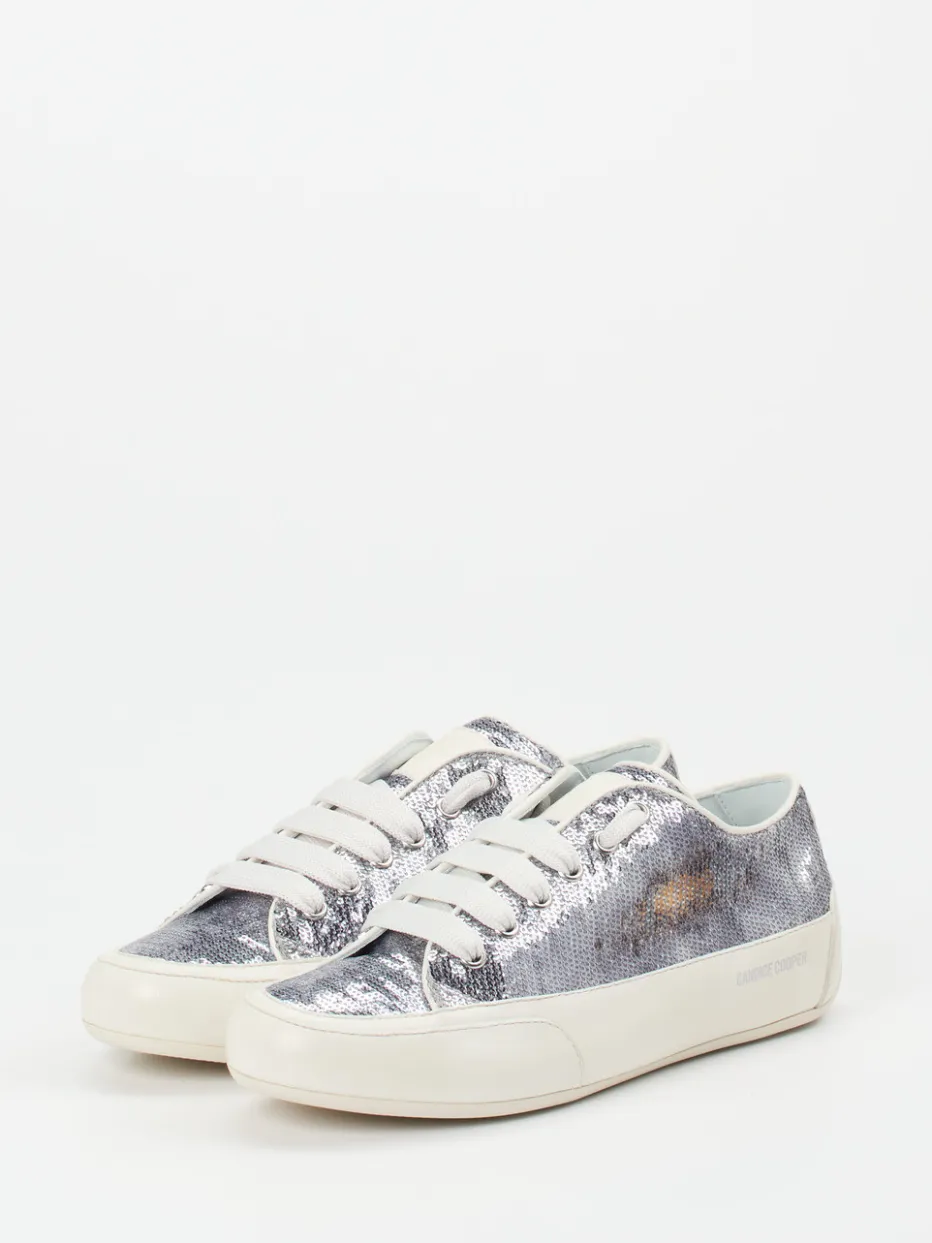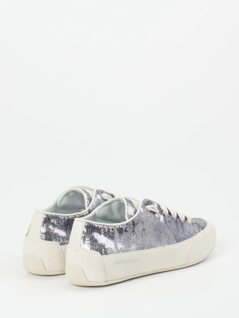 Urbaner Glanz trifft sportliche Silhouette.Candice Cooper interpretiert den Low-Top Sneaker neu – mit metallischem Statement und Party-Charakter. Ob für den täglichen Weg durch die Stadt oder einen stylischen Abend-Look: Der Sneaker aus silberfarbenem Metallic-Material begeistert mit seiner rundum besetzten Paillettenoberfläche und offwhitefarbenem Lederrahmen. Die schnörkellose, flache Silhouette mit breiten Schnürsenkeln, verstärkter Zehenpartie und flexiblem Profil vermittelt urbanen Chic und Tragekomfort. Dank Kalblederfutter und gepolstertem Wechselfußbett ist er zudem besonders bequem. Ideal für trendbewusste Outfits im Stil der Y2K- und Metallic-Trends. Ein ausdrucksstarker Eyecatcher mit dem innovativen Modeblick von Candice Cooper.