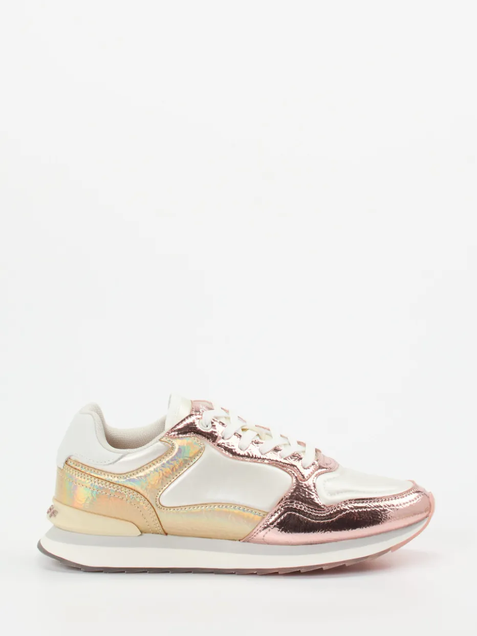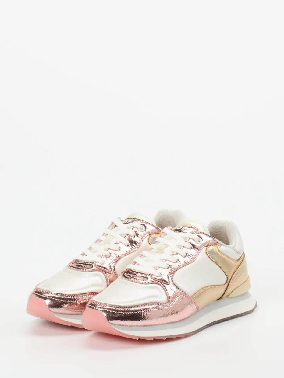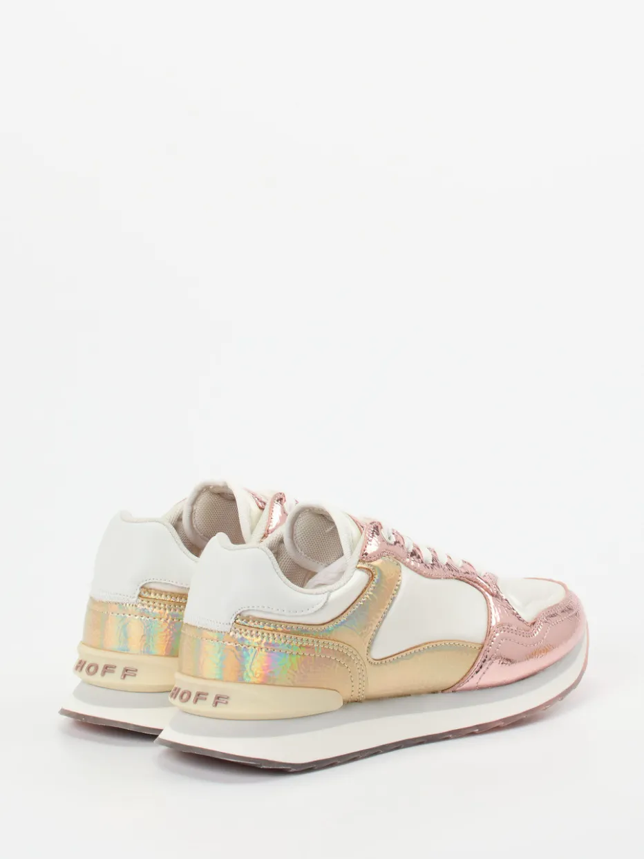 Glanzvoll und dynamisch.THE HOFF BRAND präsentiert einen Damen-Sneaker im Retro-Runner-Stil, der durch edle Metallic-Oberflächen und ein feminines Farbspiel besticht. Ob beim Stadtbummel oder Barbesuch – das Modell kombiniert cremeweißes Textil mit glänzendem Metallicleder in Roségold- und Champagnertönen. Die changierende Fersenkappe, ein komfortabler Schaftrand und der atmungsaktive Mesh-Einsatz innen sorgen für Style und Tragekomfort zugleich. Eine durchsichtige Gummisohle mit Motiv sowie Markenlogos an Lasche und Ferse setzen zusätzliche Highlights. Y2K-inspirierter Streetstyle mit glänzender Note. Ein Eyecatcher mit technischer Raffinesse – typisch HOFF.