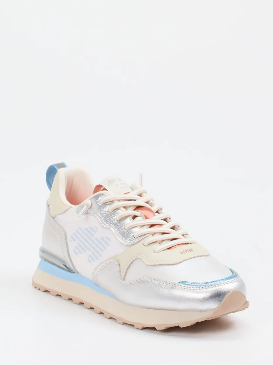 Ideal für urbane Tage mit viel Bewegung: Das Modell kombiniert atmungsaktives Textil mit silberfarbenem Metallicleder, ergänzt durch pastellige Akzente in Apricot und Hellblau. Die profilierte Gummisohle bietet sichere Trittfestigkeit, während reflektierende Details an der Ferse und eine elastische Schnürung moderne Funktionalität einbringen. Der Retro-Look im Y2K-Stil passt perfekt zu Cropped-Jeans oder einem sportlichen Kleid.