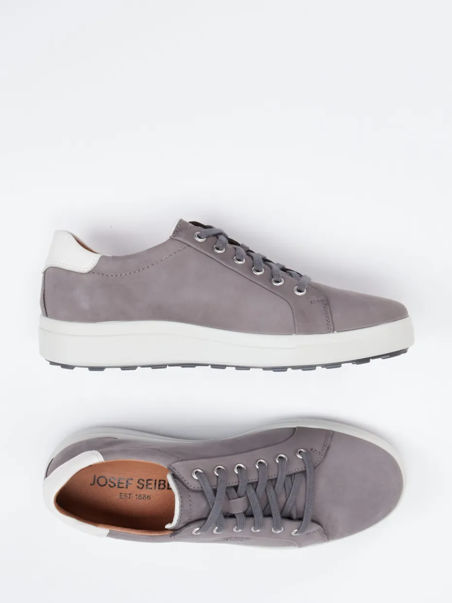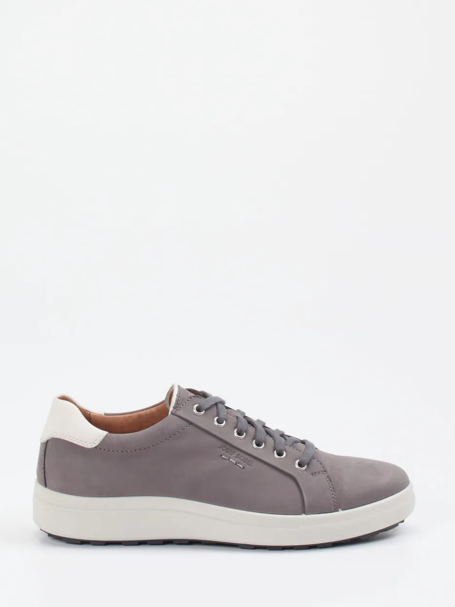 Reduziert im Design, stark im Komfort.Josef Seibel präsentiert einen schnörkellos gestalteten Low-Top-Sneaker für stilvolle Casual-Outfits. Ob beim Stadtbummel oder entspannten Treffen mit Freunden: Der in Steingrau gehaltene Sneaker kombiniert geschmeidiges Nubukleder mit matter Oberfläche und einem komfortabel gepolsterten Fersenbereich. Die weiße Kontrastpartie an der Ferse betont die klassische Rundsilhouette dezent, silberne Metallösen und symmetrische Schnürung runden das durchdachte Design ab. Eine profilierte Gummisohle sorgt für sicheren Grip und rundet den alltagstauglichen Stil funktional ab. Ideal zu Chinohose oder leichter Übergangsjacke. Unaufdringlicher Look trifft auf überzeugende Markenqualität.