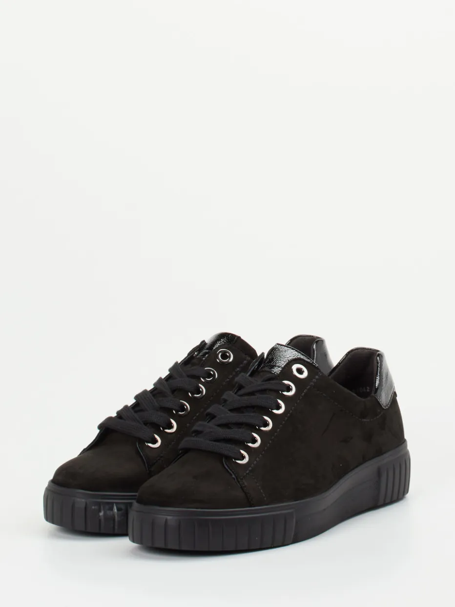 Dieser Damen-Sneaker kombiniert hochwertiges Nubukleder mit stilvollen Lackdetails und rundet monochrome Looks elegant ab. Die bequeme Luftpolstersohle sorgt für langanhaltenden Komfort.