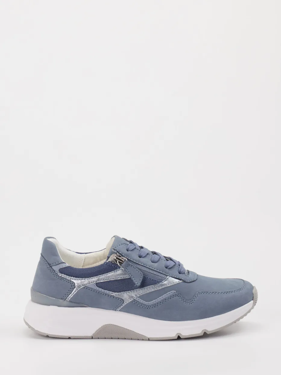 Sportlich-eleganter Look trifft auf Komfort. Gabor Comfort präsentiert einen Damen-Sneaker, der Alltagstauglichkeit stilvoll interpretiert. Ideal für den Einsatz in Freizeit und Alltag bietet der Schuh eine komfortorientierte Ausstattung mit Leder-/Textilfutter und einer Gummisohle mit rutschhemmendem Profil. Das Obermaterial aus Nubukleder zeigt sich in einem modernen Jeansblau mit kontrastierenden Einsätzen aus Mesh und dezenten silberfarbenen Highlights. Die klassische flache Silhouette wird durch den seitlichen Reißverschluss ergänzt, der ein bequemes An- und Ausziehen ermöglicht. Stilistisch verbindet der Sneaker streetwear-inspirierten Athleisure-Chic mit funktionaler Leichtigkeit. Harmonisch kombinierbar zu Denim oder gedeckten Tönen. Gabor Comfort vereint hochwertige Materialien mit alltagstauglicher Passform für stilvolle Bequemlichkeit.