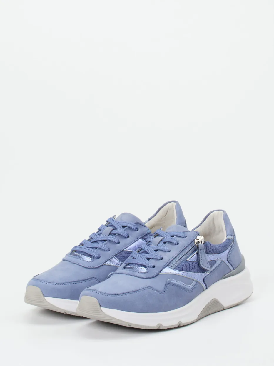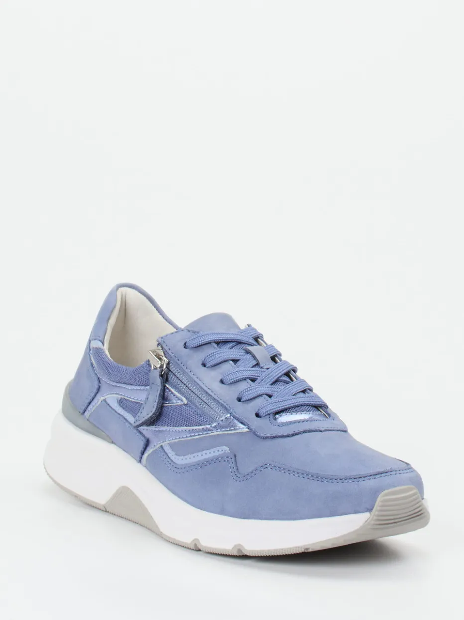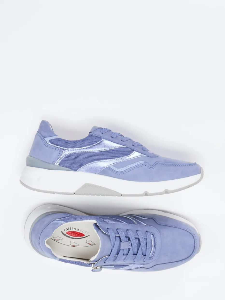 Trendiger Komfort für aktive Alltagstage.Gabor Comfort bringt mit diesem Damen-Sneaker eine stilvolle Verbindung aus Tragekomfort und angesagtem Design. Ideal für entspannte Freizeitaktivitäten bieten das samtig angeschliffene Nubukleder und atmungsaktive Mesh-Einsätze nicht nur ein angenehmes Fußklima, sondern auch eine zeitgemäße Optik. Die sportlich-bulky Silhouette in Lavendelblau mit hellgrauen und weißen Akzenten wird durch glänzende Metallic-Applikationen stilsicher abgerundet. Schnürung in Kombination mit seitlichem Reißverschluss erlaubt komfortables Anziehen. Die profilierte Rollingsoft-Gummisohle unterstützt den Fuß ergonomisch und sorgt für Stabilität. Besonders gut kombinierbar mit Casual-Outfits in Pastelltönen. Ein sportlich-eleganter Begleiter mit durchdachter Funktionalität – typisch Gabor Comfort.