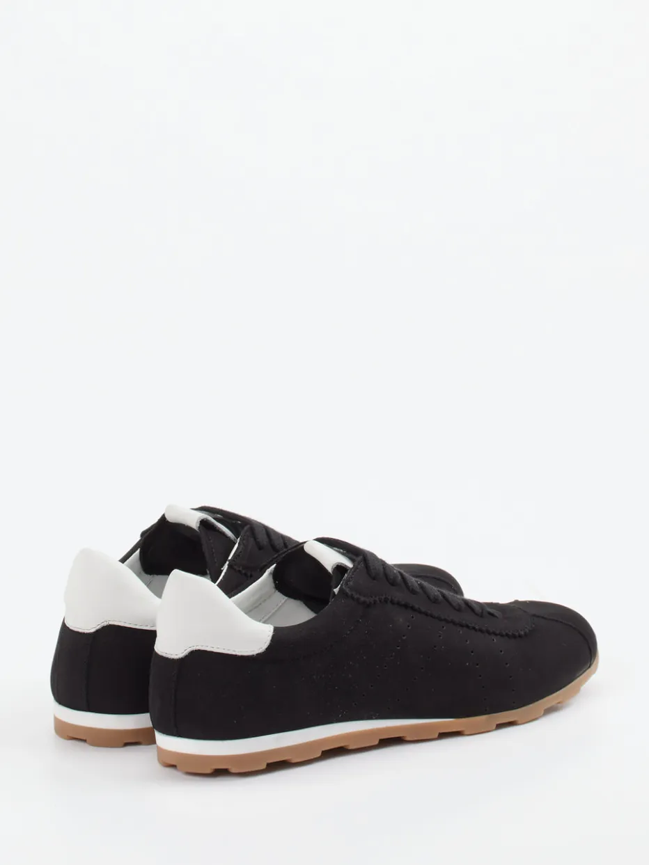 Stilvoll durch den Tag.Andrea Sabatini präsentiert mit diesem Sneaker ein modisches Highlight für Alltag und Freizeit. Das schwarze Nubukleder überzeugt mit einer samtigen Haptik sowie robuster Qualität – ergänzt durch weiße Akzente an Zunge und Ferse. Die flache, schmale Silhouette erinnert an klassische 90er-Runner und betont den Retro-Charakter. Eine profilierte, honigfarbene Gummisohle sorgt für zuverlässigen Grip. Dank weichem Kalblederfutter und Wechselfußbett bietet der Schuh hohen Tragekomfort. Stilistisch ideal zu Jogpants oder lässigen Jeans. Ein urban inspirierter Sneaker, der souverän Komfort und Zurückhaltung verbindet.