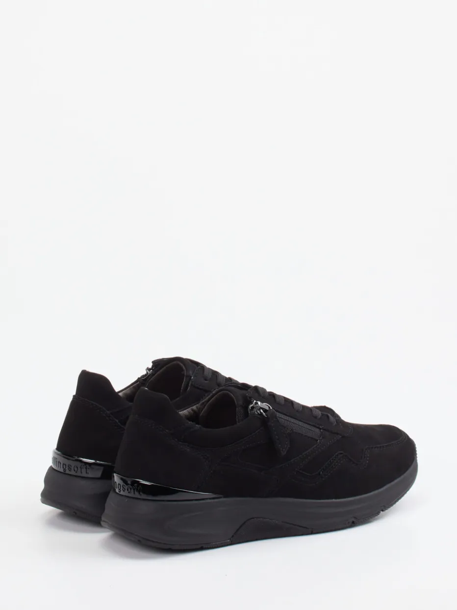 Bewegung trifft Minimalismus.Gabor Comfort präsentiert einen Damen-Sneaker für Alltag und Freizeit. Die sportlich abgerundete Silhouette in tiefem Schwarz setzt auf dezentes Design mit funktionaler Raffinesse. Hochwertiges Nubukleder, samtig angeschliffen, trifft auf ein weiches Leder-/Textilfutter und eine gepolsterte Gummisohle mit ergonomischer Form. Ein seitlicher Reißverschluss ergänzt die klassische Schnürung und erleichtert das An- und Ausziehen. Glänzende Details an der Ferse verleihen dem matt gehaltenen Schuh einen modernen Akzent – perfekt für minimalistische Streetwear-Looks. Ein Allrounder mit Komfortprofil – entwickelt für das entspannte, stilvolle Gehen.