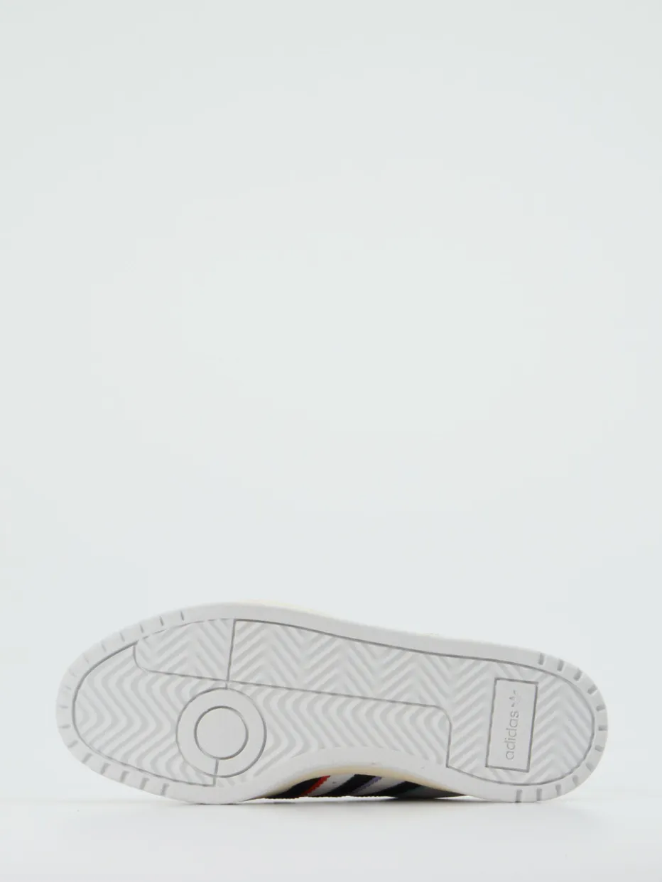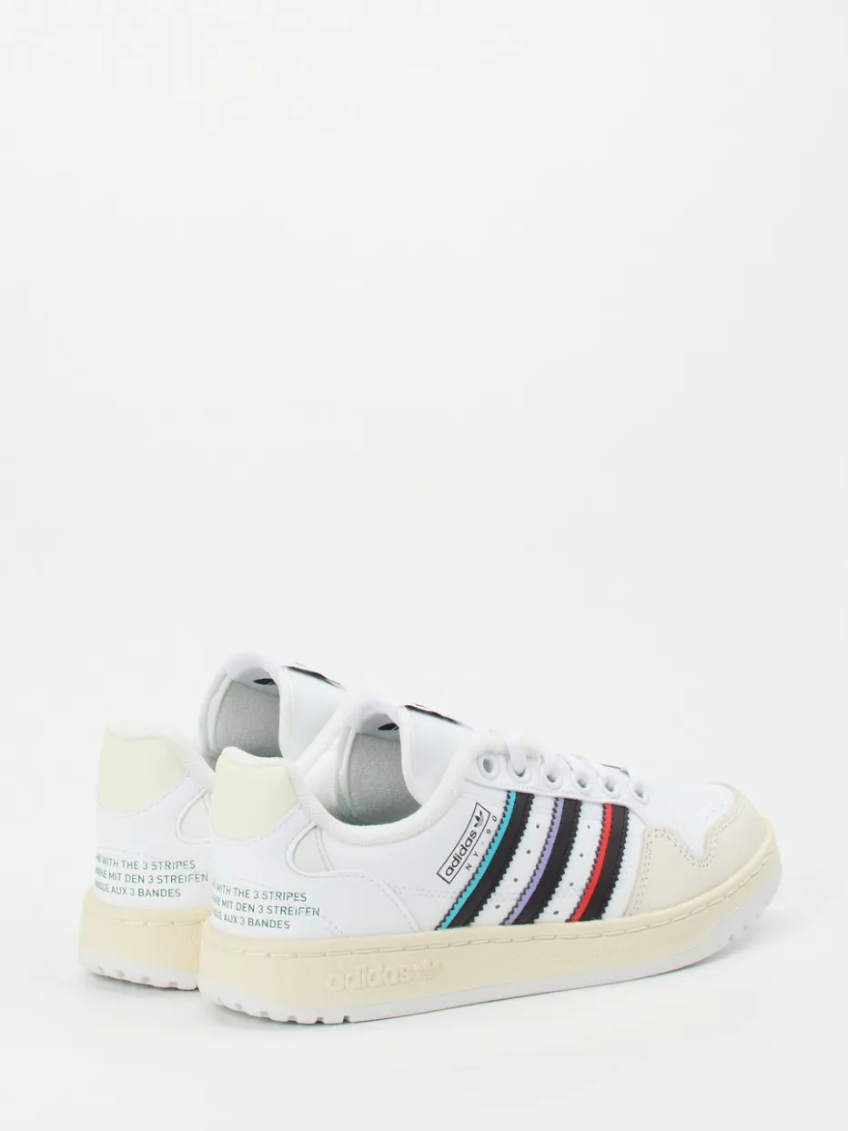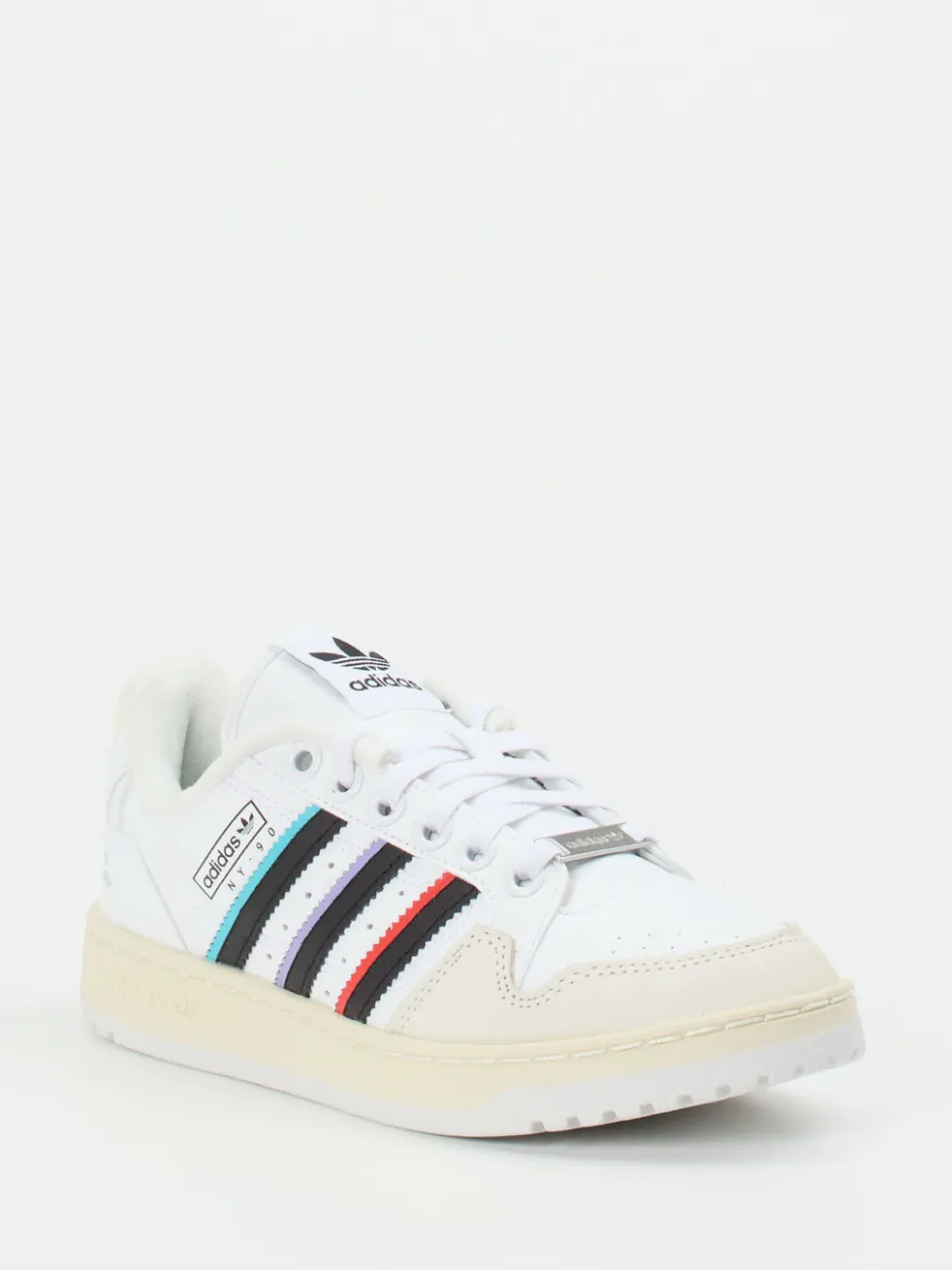 Ein Statement für Streetwear-Fans.Adidas präsentiert mit diesem Sneaker aus der NY 90 Stripes-Serie ein sportiv-urbanes Modell im Low-Top-Format. Klassische Freizeit-Outfits erhalten mit diesem Sneaker ein modernes Update. Gefertigt aus funktionalem Synthetik mit glatter Oberfläche, überzeugt er durch klare Farbtöne in Weiß und Creme sowie markante Streifendetails in Türkis, Schwarz, Lila und Rot. Die flache Silhouette mit perforierter Zehenpartie und verstärkter Ferse betont den Retro-Basketball-inspirierten Charakter. Eine griffige Gummisohle und gepolstertes Textilfutter versprechen hohen Tragekomfort – perfekt für Alltag und Ausgehen. Gut kombinierbar mit Baggy Jeans und Oversized-Hoodie. Ein authentischer Sneaker mit Streetstyle-Appeal aus dem Hause Adidas.
