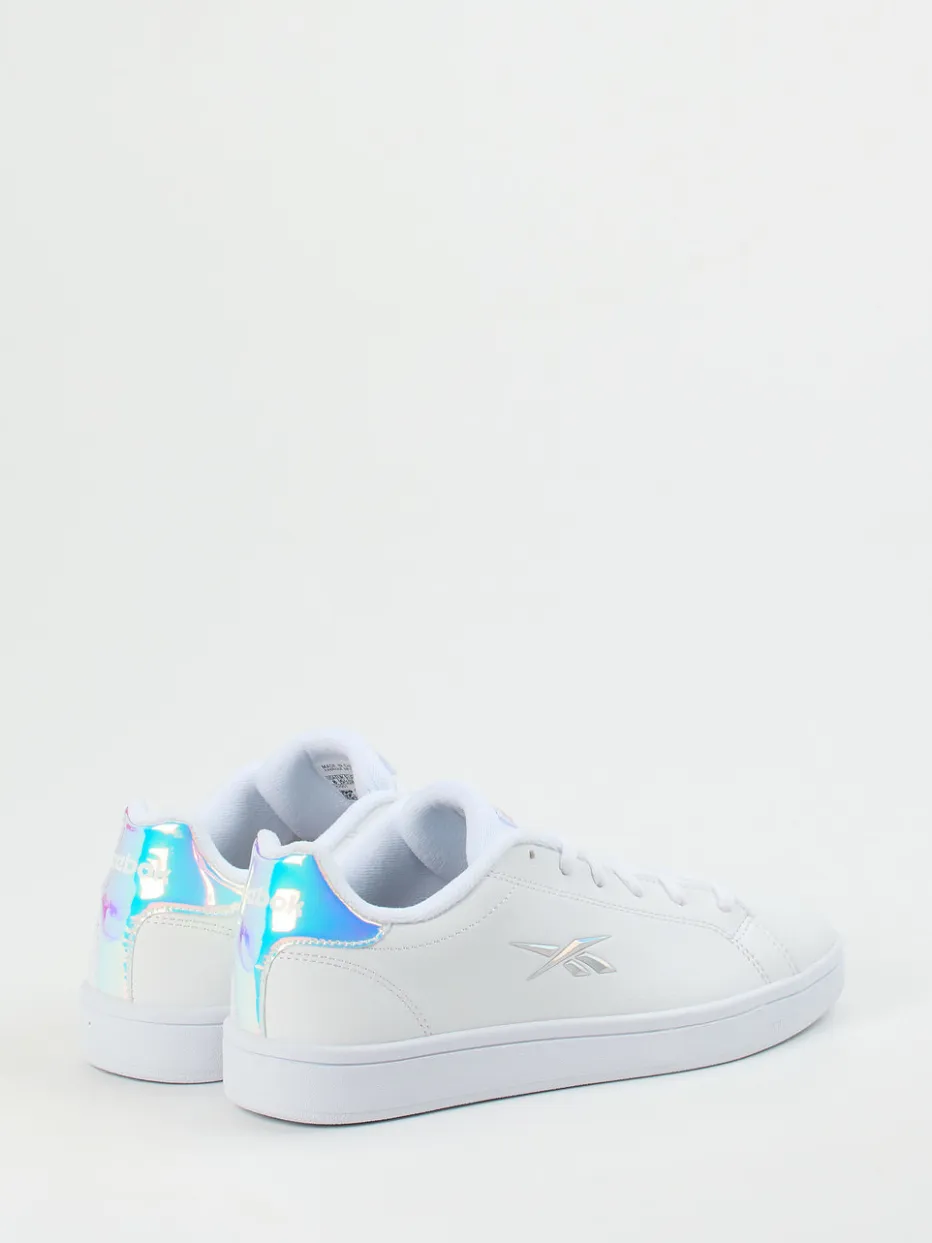 Ideal für Alltag und Freizeit überzeugt das Modell mit weißem Synthetik-Obermaterial in matter Optik und dezenten Metallic-Logos. Der holografisch schimmernde Fersenbesatz bringt subtile Irideszenz ins Spiel. Klassisch flach in der Silhouette sowie mit gepolstertem Einstieg versehen, bietet der Sneaker spürbaren Komfort – unterstützt vom atmungsaktiven Textilfutter und einem Ortholite-Fußbett. Durch die cleane Optik lässt er sich besonders gut zu urbanen Styles oder entspannten Streetwear-Looks kombinieren.