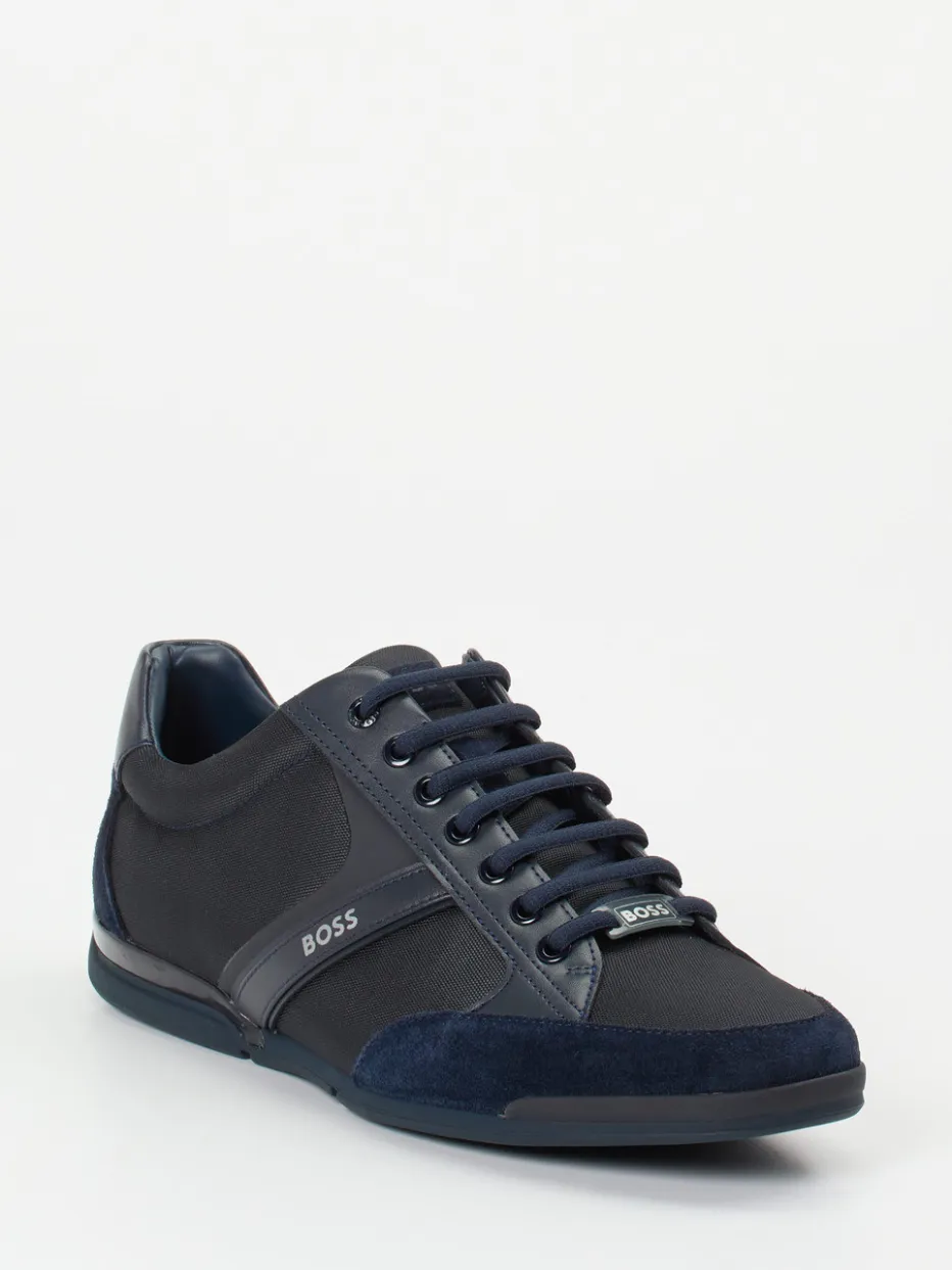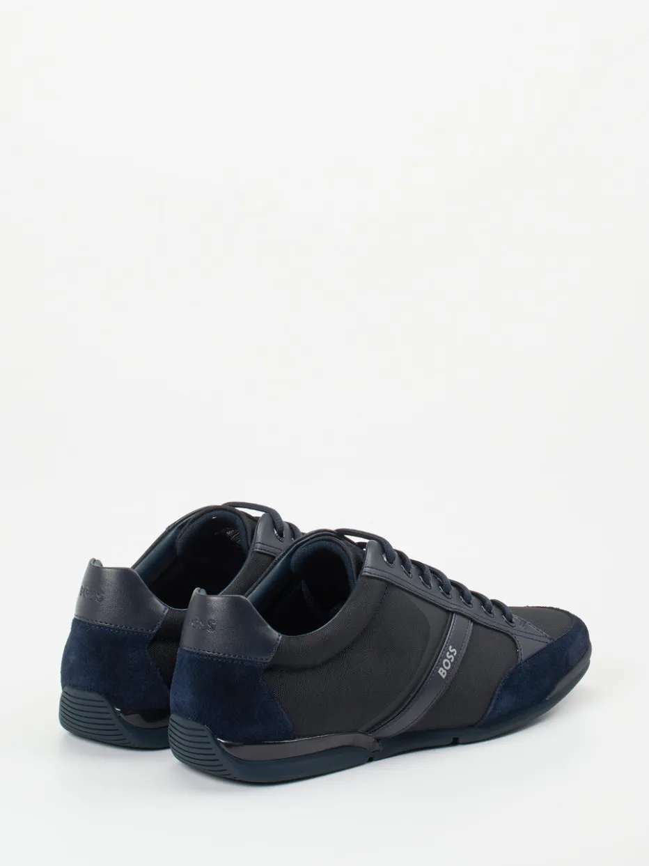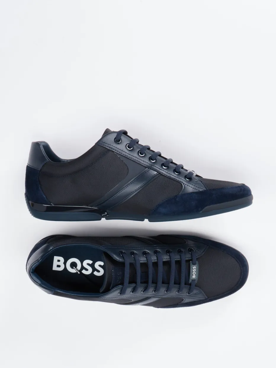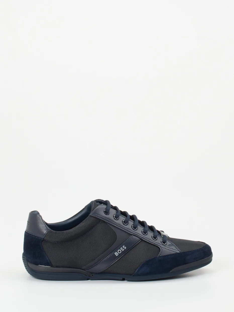 Eleganz im urbanen Stil.Boss präsentiert mit diesem Low-Top-Sneaker ein modisch-sportives Highlight für Alltag und Business. Die Kombination aus synthetischem Obermaterial, samtig angeschliffenem Veloursleder und Meshtextil im Inneren sorgt für eine hochwertige Anmutung und hohen Tragekomfort. In Dunkelblau gehalten und mit anthrazitfarbenen sowie schwarzen Akzenten versehen, besticht das Modell durch seine reduzierte, flache Silhouette, Schnürung und tonale Logo-Applikationen. Die abriebfeste Gummisohle rundet den minimalistischen Look funktional ab. Perfekt abgestimmt auf monochrome Looks und den Trend „Quiet Luxury“. Der markant zurückhaltende Stil spiegelt die Premium-DNA von Boss wider.
