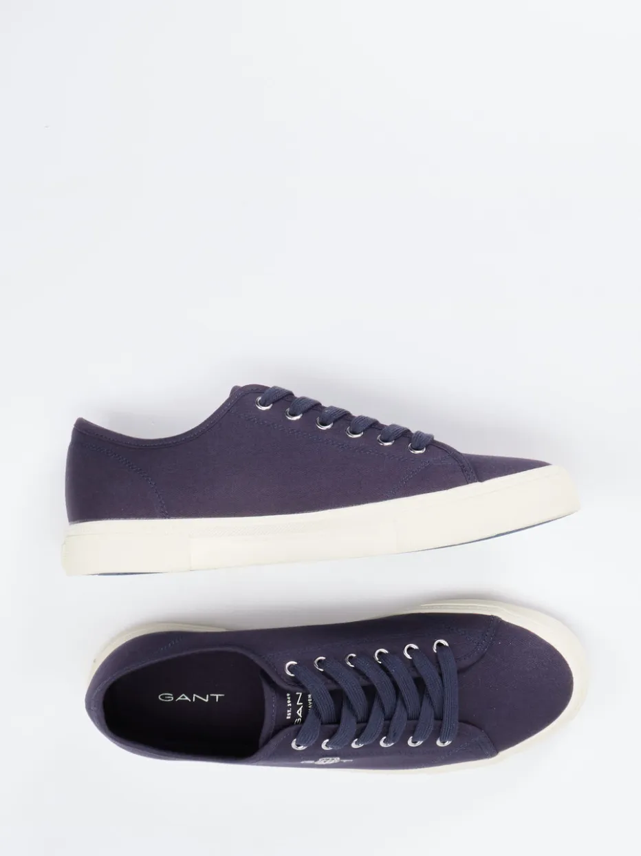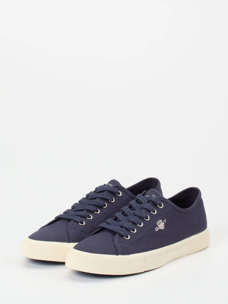 Gant präsentiert einen Low-Top-Sneaker für die Freizeit. Das Modell überzeugt mit einem dunkelblauen Obermaterial aus veganem Textil mit matter Canvas-Haptik und silberfarbenen Metallösen.