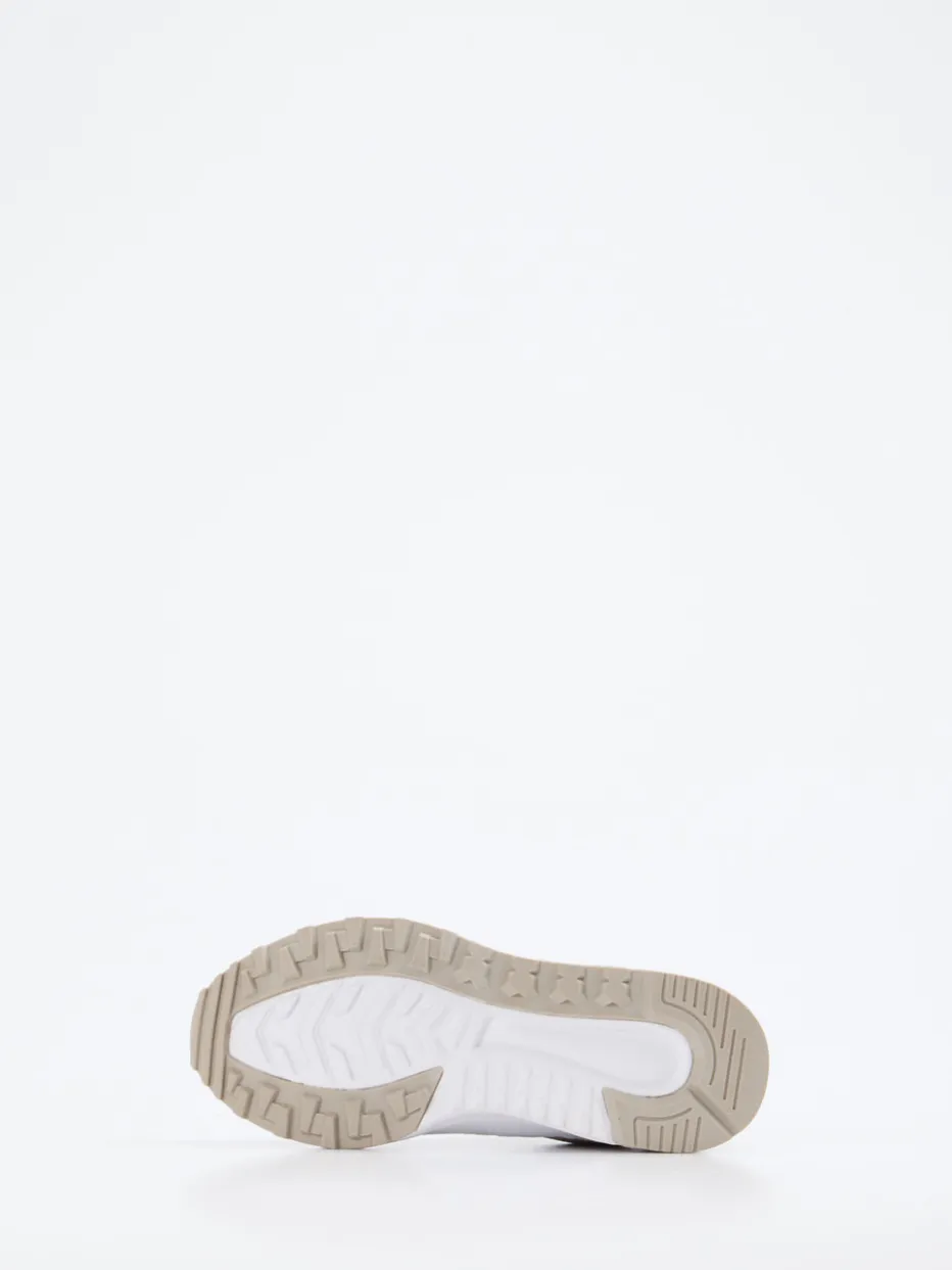 Ideal für Alltag und Freizeit überzeugt das Modell mit einer Kombination aus Textil und synthetischem Material in beigegrauer Farbwelt. Irisierende Schimmer-Overlays setzen Akzente auf der matt gehaltenen Oberfläche. Die klassische Low-Top-Silhouette wird durch gepolsterten Einstieg und praktische Zuglasche abgerundet. Eine rutschfeste Gummisohle sorgt für Trittsicherheit auf Schritt und Tritt. Perfekt zu Leggings, Jeans oder Sportoutfits im Streetwear-Stil.