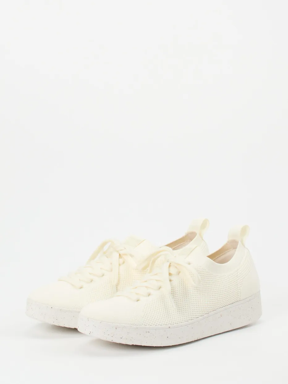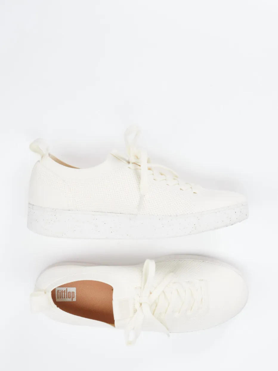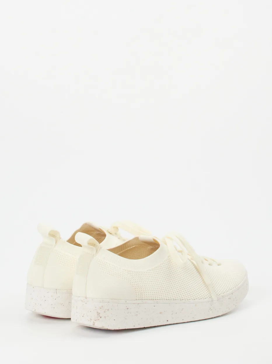 Modernes Understatement für jeden Tag.FitFlop präsentiert mit diesem Damen-Sneaker ein lässiges Modell aus softem Textilstrick. Ideal für entspannte Wege zwischen Café, Büro oder Spaziergang im Park. Das atmungsaktive Textilmaterial in Cremeweiß ist samtig matt, nahtlos verarbeitet und sitzt wie eine zweite Haut. Die recycelte Gummisohle mit gesprenkeltem Finish vereint Komfort mit Stil und sorgt für leichten Halt. Eine rückseitige Zuglasche erleichtert das Anziehen, die Schnürung bietet sicheren Sitz. Inspiriert vom „Quiet Luxury“-Trend, passt dieser Sneaker perfekt zu nachhaltigen Basics. Sichtbare Hochwertigkeit trifft auf funktionale Leichtigkeit – markentypisch FitFlop.