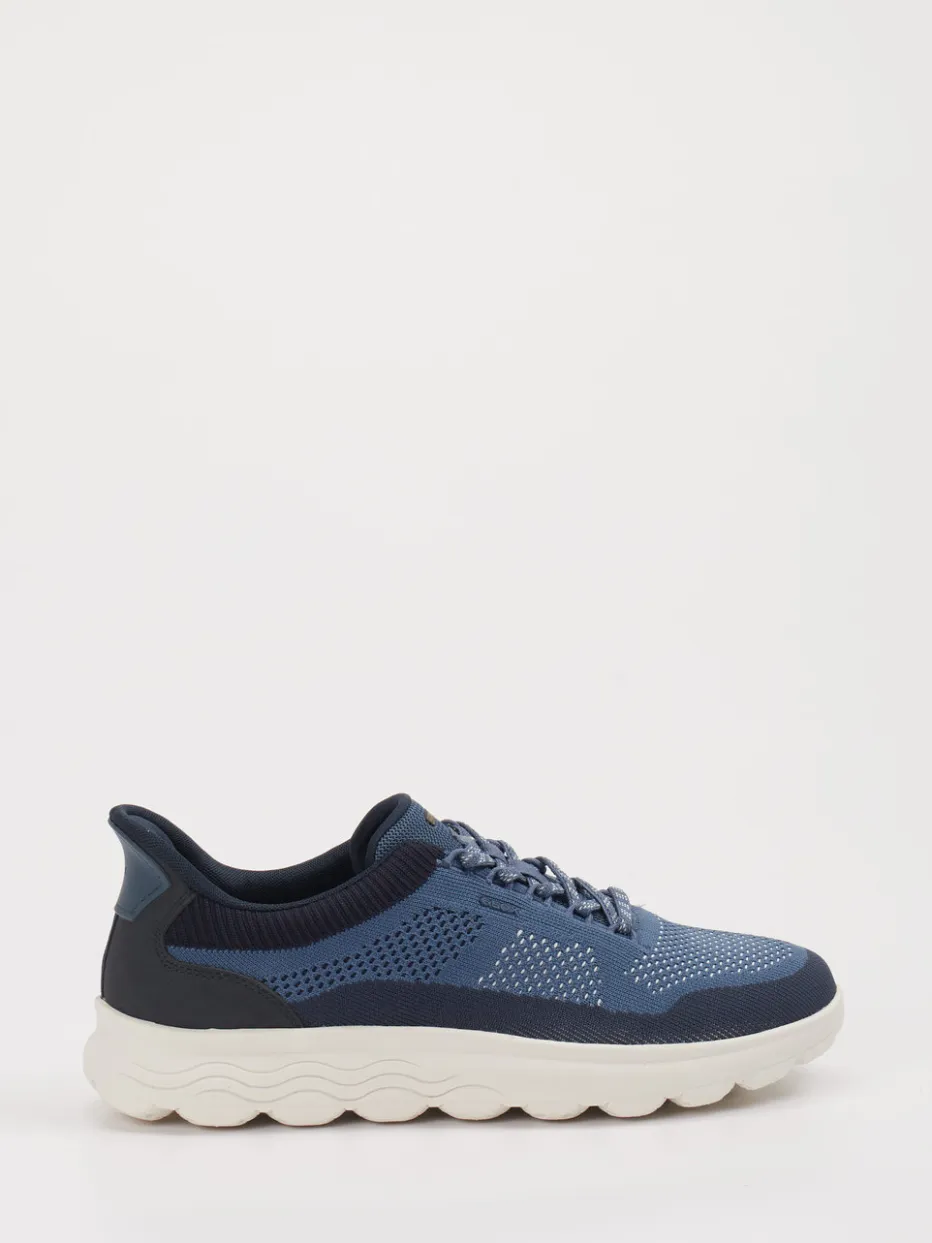 Aktiv und stilvoll unterwegs. Geox präsentiert diesen modernen Herren-Sneaker als idealen Begleiter für entspannte Freizeitmomente und urbane Unternehmungen. Das atmungsaktive Textilstrick-Obermaterial in Jeansblau mit dunkelblauen und offwhite Akzenten verbindet leichten Tragekomfort mit sportiver Optik. Die abgerundete Silhouette, zweifarbige Schnürsenkel und das Logo auf Zunge und Ferse unterstreichen den modischen Streetwear-Charakter. Eine profilierte Gummisohle mit Dämpfungselementen sorgt für Trittsicherheit und unterstützt das angenehme Laufgefühl. Als Teil aktueller Knitwear- und Athleisure-Trends harmoniert der Look ideal mit sportiven Outfits wie Jogpants oder Cargo-Shorts. Geox steht für atmungsaktive Innovation und markentypische Komfortfunktion.