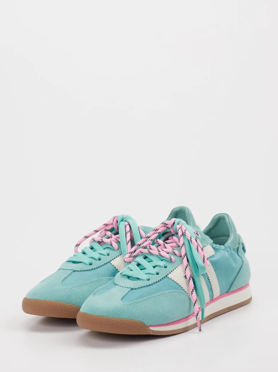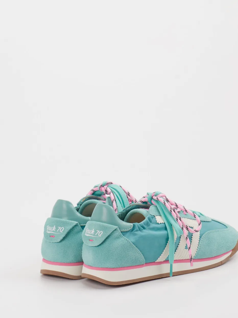Retro-Flair mit modernem Pastellspiel. Back 70 präsentiert mit diesem Damen-Sneaker einen Retro Runner im angesagten Streetwear-Stil. Ideal für urbane Looks im Frühling, überzeugt der flach geschnittene Sneaker durch eine hochwertige Kombination aus Veloursleder und textilem Futter. Das dominante Türkisgrün wird raffiniert durch rosa Details und kontrastfarbene Schnürsenkel akzentuiert. Die weiße Gummisohle sorgt für eine dezente Basis, während das gepolsterte Fersenstück angenehmen Tragekomfort bietet. Designseitig verweisen der schmale Schnitt und die Logo-Prägung auf klassische 90er-Jahre-Silhouetten. Perfekt zu Jeans, Jogpants oder Plisseeröcken im Alltagsmix. Markentypischer Komfort mit stilsicherer Vintage-Note.