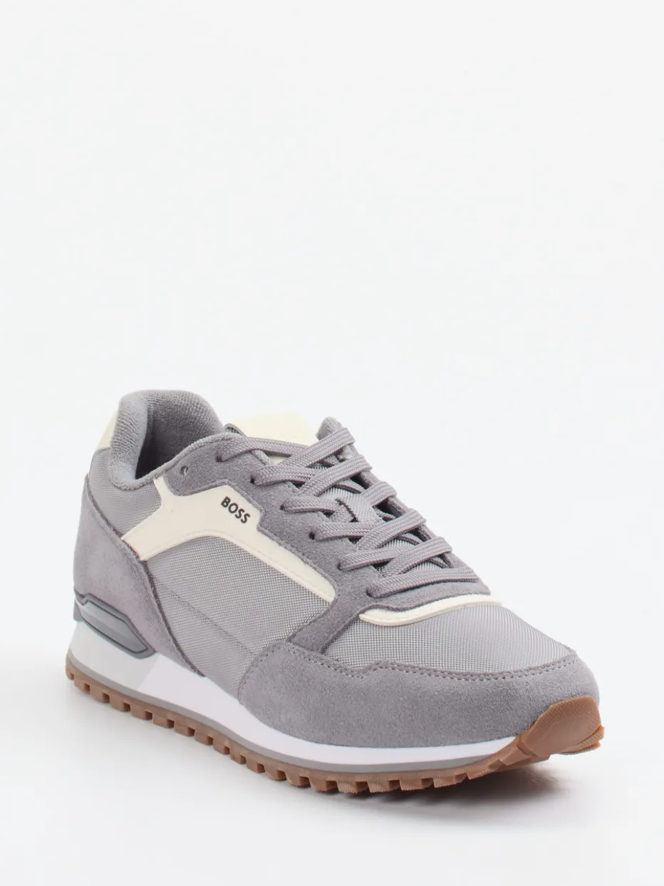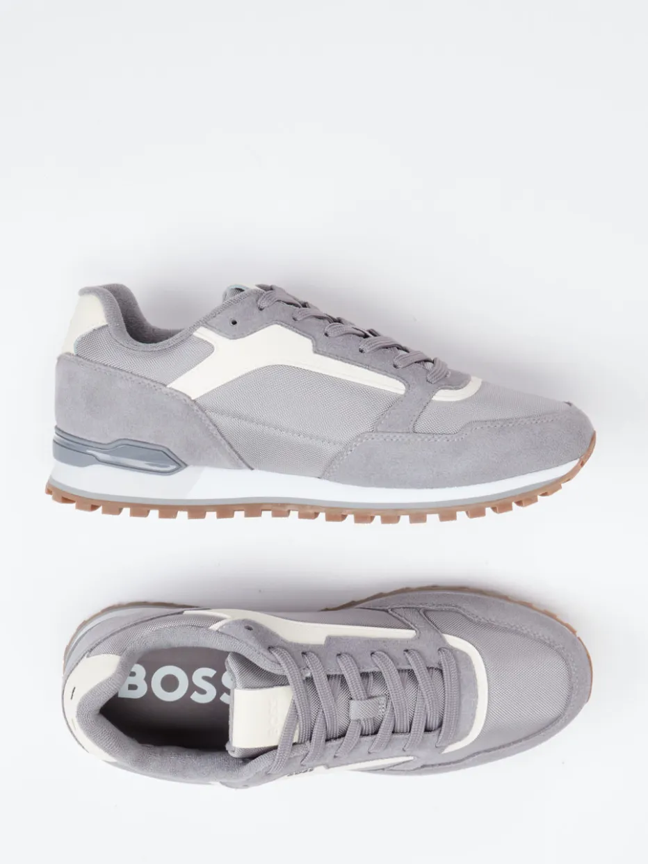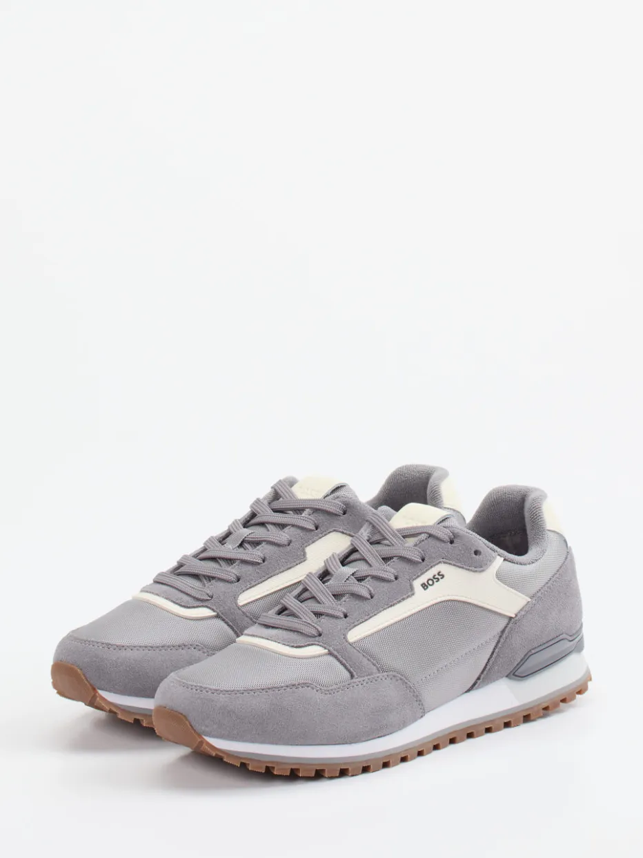 Retro-Akzent für urbane Styles.Mit dem Herren-Sneaker von Boss trifft sportiver Streetwear-Charme auf eine stilvolle Retro-Ästhetik. Ideal für entspannte Freizeitmomente bietet der Retro Runner durch das Zusammenspiel aus Velour/Textil einen angenehmen Mix aus weicher Haptik und robuster Funktion. Mittelgraues Obermaterial mit cremefarbenen und hellbraunen Akzenten unterstreicht die klassische Running-Silhouette. Details wie eine ergonomische Schnürung, gepolsterter Schaftrand und griffige Gummiprofilsohle ergänzen den Look funktional. Der dezente Logo-Schriftzug fügt sich harmonisch ein. Kombiniert mit Jogpants oder Bomberjacke entsteht ein trendiges Soft-Colorblocking-Ensemble. Komfortorientiertes Design mit authentischem Boss-Finish für stilbewusste Casual-Looks.
