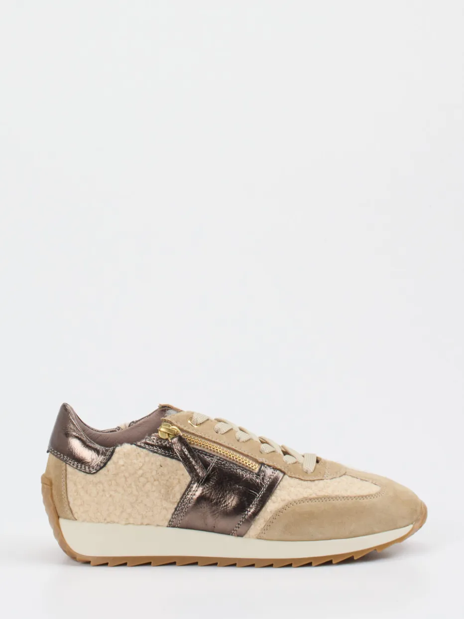 Materialmix mit Retro-Charme.DL Sport interpretiert den klassischen Damen-Sneaker mit Retro-Runner-Einflüssen neu. Ideal für lässige Freizeit-Looks: Das Modell kombiniert weiches Veloursleder mit flauschigen Textilpartien in Teddyfutter-Optik und glänzenden Metallic-Akzenten in Bronze. In harmonischem Beige gehalten, überrascht der Schuh mit strukturierten Kontrastmaterialien und goldfarbenem Reißverschluss neben der Schnürung. Die flache, profilierte Gummisohle unterstützt dabei sicheren Tritt und Alltagstauglichkeit. Dank komfortablem Innenfutter aus Leder und der Eignung für Einlagen bietet der Sneaker hohe Bequemlichkeit. Typisch DL Sport: stilbewusste Funktionalität mit modischem Finetuning.