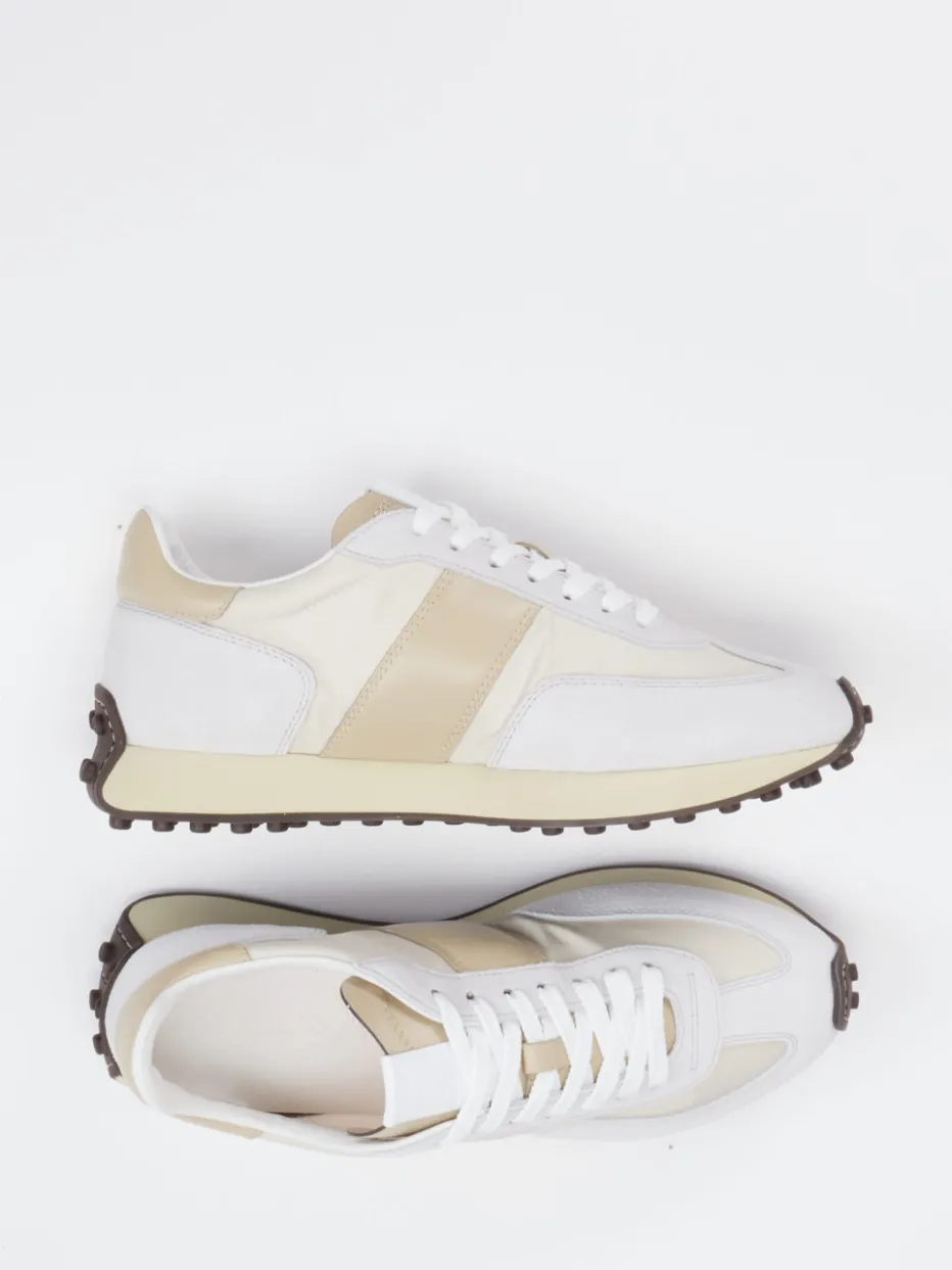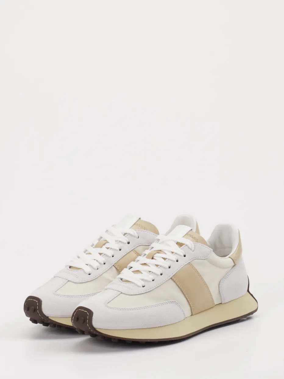 90s-inspirierter Alltags-Liebling. Tod’s interpretiert den klassischen Runner mit diesem Sneaker neu – in einer Kombination aus Velour und Textil. Ob für einen Spaziergang durch die Stadt oder entspannte Stunden im Café – das Modell überzeugt mit seiner glatten, matten Oberfläche in Offwhite sowie beigefarbenen Overlays. Die Gummisohle mit charakteristischem Noppenprofil sorgt nicht nur für guten Grip, sondern unterstreicht den Retro-Charakter. Dank flacher Silhouette und Schnürverschluss wirkt das Design zeitlos, stilvoll und vielseitig kombinierbar – etwa mit Jogpants oder Clean Denim. Ein stilbewusster Begleiter für moderne Streetwear mit luxuriösem Understatement.