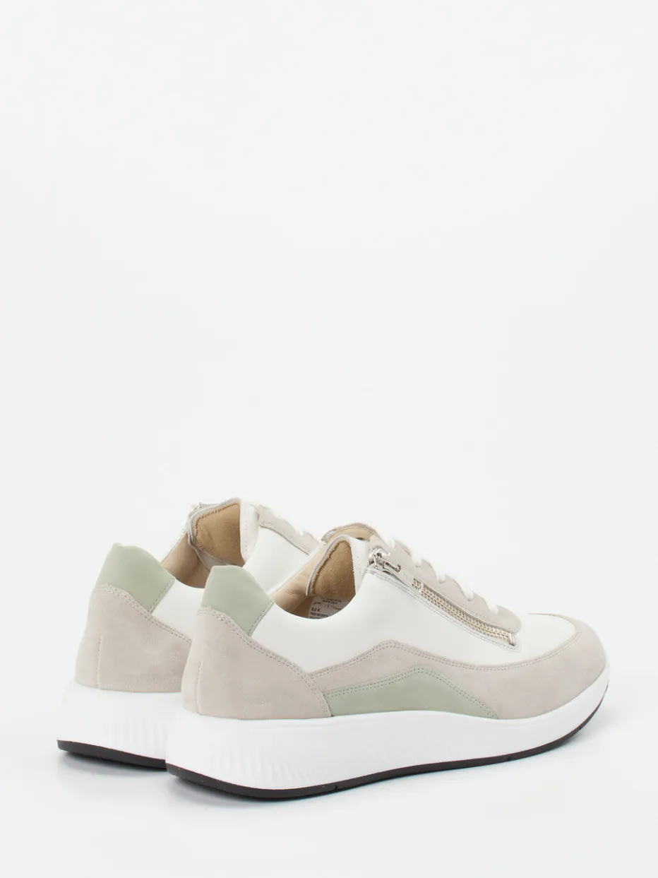 Viel Komfort für entspannte Wege.Solidus präsentiert mit diesem Sneaker ein Damenmodell der Linie Kalea, das funktionalen Komfort in lässigem Design vereint. Ideal für lange Tage unterwegs: Die cleane Silhouette in Cremeweiß mit salbeigrünen und beigegrauen Akzenten wirkt modern und ruhig zugleich. Feines Kalbleder trifft auf samtig angeschliffenes Veloursleder – ergänzt durch ein atmungsaktives Leder-/Textilfutter. Schnürung und seitlicher Reißverschluss ermöglichen schnelles Anziehen, während das herausnehmbare Korkfußbett in Weite K für angenehme Dämpfung sorgt. Die leichte Sohle mit schwarzem Profil bietet sicheren Halt. Ein Styling-Partner für athleisure-inspirierte Looks mit komfortstarkem Auftritt.