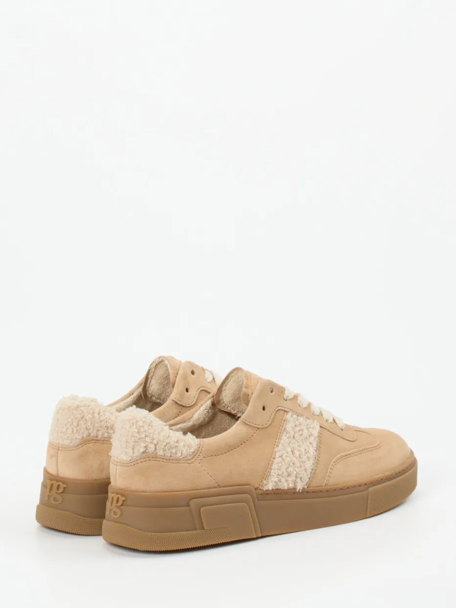 Ideal für entspannte Tage im Alltag oder Zuhause überzeugt das Modell mit weichem Veloursleder in warmem Beigebraun, ergänzt durch ein kontrastierendes Teddyfutter in Creme an der Fersenkappe. Die klassische, abgerundete Form mit weißer Schnürung und breiter Gummisohle sorgt für ein bequemes Tragegefühl. Goldfarbene Logodetails auf der Zunge und strukturierte Textileinsätze setzen dezente Akzente. Inspiriert von Streetwear und dem Teddy-Trend FW24 lässt sich der Schuh besonders gut zu Cordhosen oder Kuschelstrick kombinieren.