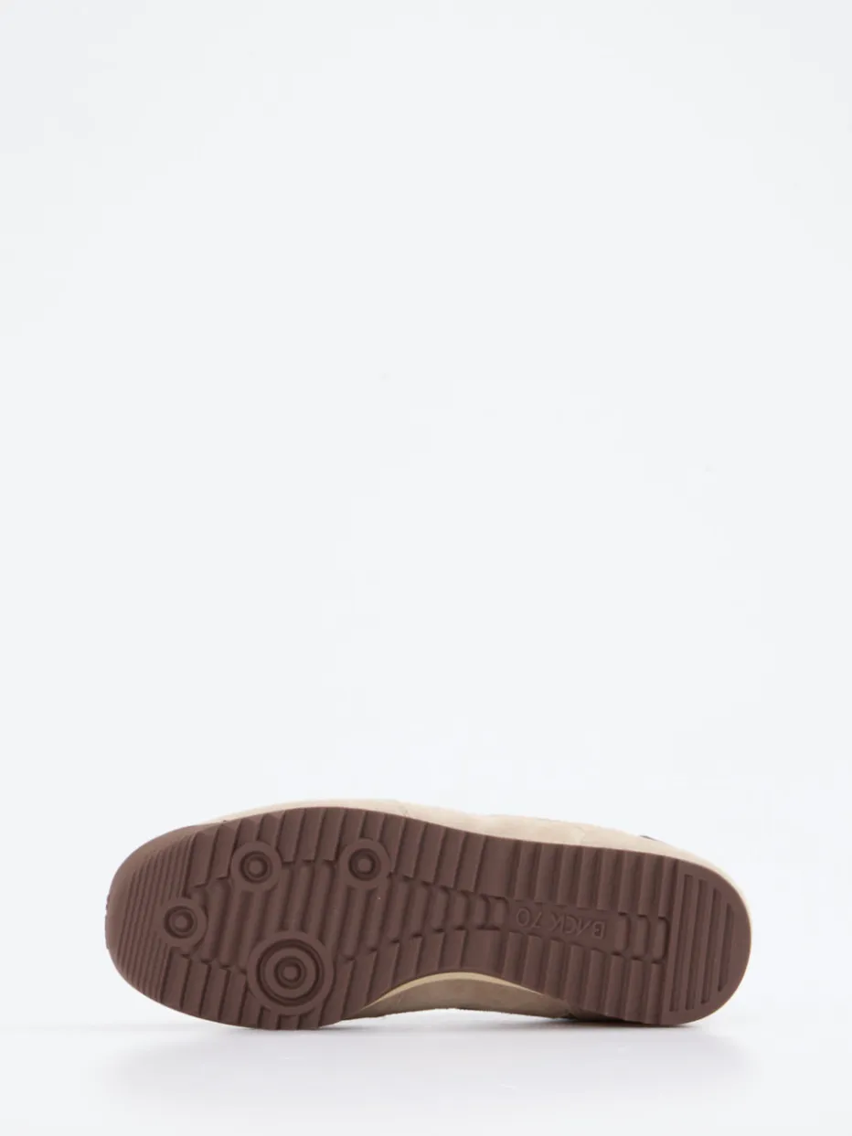 70s-Charme mit modernem Komfort.Back 70 präsentiert mit diesem Sneaker eine Hommage an das sportliche Design der 70er-Jahre. Ob für entspannte City-Tage oder kreative Office-Outfits – das softe Kalbleder im Farbton Milchkaffee ergänzt sich perfekt mit grauen Veloursleder-Overlays. Schokobraune Kontrastdetails und ein seitliches Logo setzen markante Akzente. Die flache, schmale Silhouette trifft auf eine stoßdämpfende Gummisohle mit Profil, die sicheren Grip verspricht. Innen sorgt ein atmungsaktives Textilfutter für ein angenehmes Fußklima, während eine Memory Foam-Einlage besonderen Komfort bietet. Lässig zu Jogpants oder Denim – ein Favorit im Retro Runner Trend. Italienisches Design mit Stilgefühl und Alltagstauglichkeit.