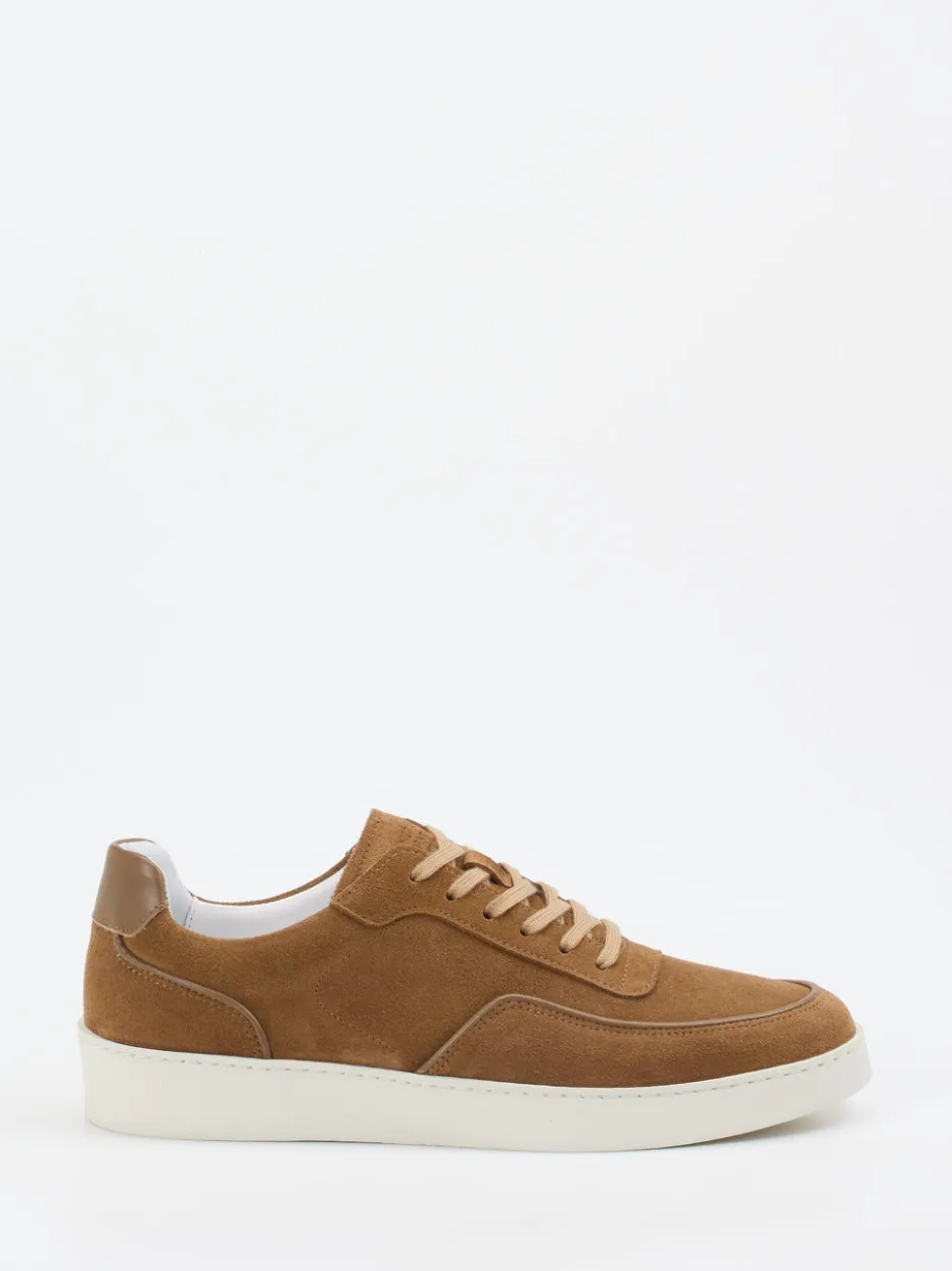 Hochwertiges Veloursleder in edlem Cognacton trifft auf minimalistisches Design und feine Materialakzente – ideal für moderne Casual-Looks mit Understatement.