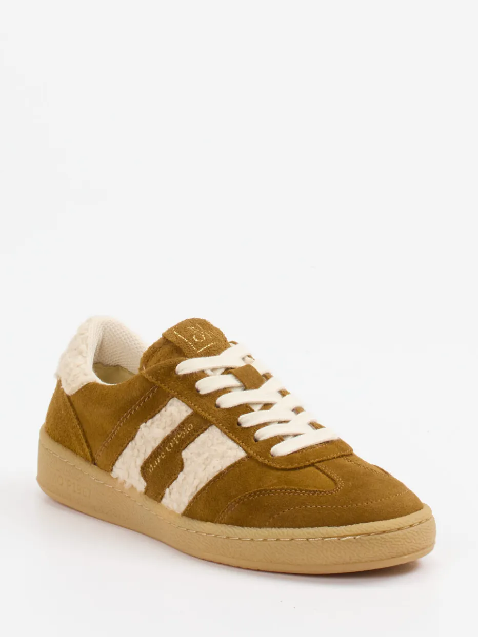 Komfort trifft Trendbewusstsein.Marc O’Polo präsentiert diesen Low-Top-Sneaker für Damen als urbane Hommage an Retro-Sportswear und Casual-Streetwear. Ideal für entspannte Herbsttage und stilvolle Alltagsmomente überzeugt das Modell durch weiches Veloursleder in Cognacbraun, ergänzt um gekräuselten Teddy-Fleece in Wollweiß. Die klassische, abgerundete Silhouette mit Schnürverschluss trifft auf eine flexible Gummisohle mit griffigem Profil. Atmungsaktives Textilfutter und ein gepolstertes Wechselfußbett bieten spürbaren Komfort. Tonale Nähte und Logo-Prägungen setzen elegante Designakzente. Perfekt kombinierbar mit beige-naturfarbenen Casual-Looks oder Oversized-Hoodies. Der stilvolle Materialmix vereint Marc O’Polos Qualität mit aktuellen Designtrends.