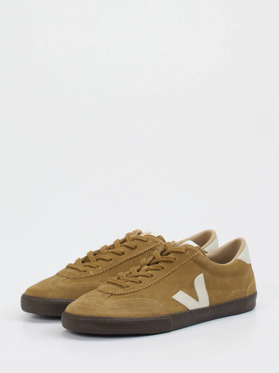 Retro-Look trifft nachhaltigen Stil.VEJA präsentiert einen Low-Top-Sneaker aus cognacfarbenem Veloursleder. Ideal für entspannte Alltags-Looks punktet das Modell mit weicher, matt strukturierter Oberfläche und minimalistischer Linienführung. Das flache Design liegt durch seine klassische Silhouette im Trend und harmoniert mit der kontrastierenden Gummisohle in Dunkelbraun. Weiße Logo-Applikationen und Ton-in-Ton-Nähte ergänzen den retroinspirierten „Quiet Luxury“-Charakter. Die Schnürung sorgt für sicheren Sitz, das Textilfutter bietet angenehmen Tragekomfort – auch barfuß. Kombiniert zu Canvas-Rucksack oder Basic-Shirts entsteht ein mühelos lässiger Look. Ein zeitloses Unisex-Modell mit nachhaltigem Markenprofil und stilistischer Zurückhaltung.