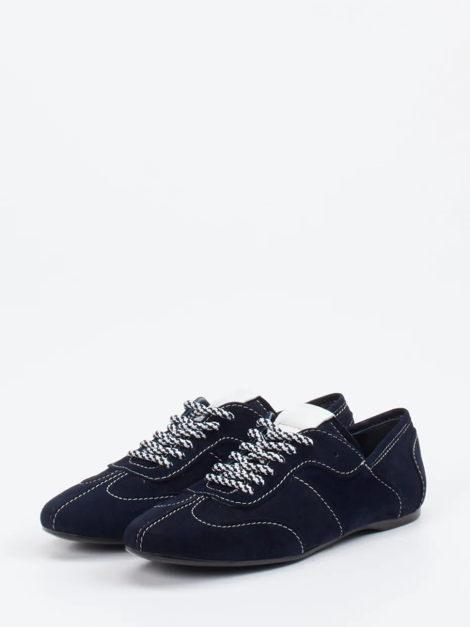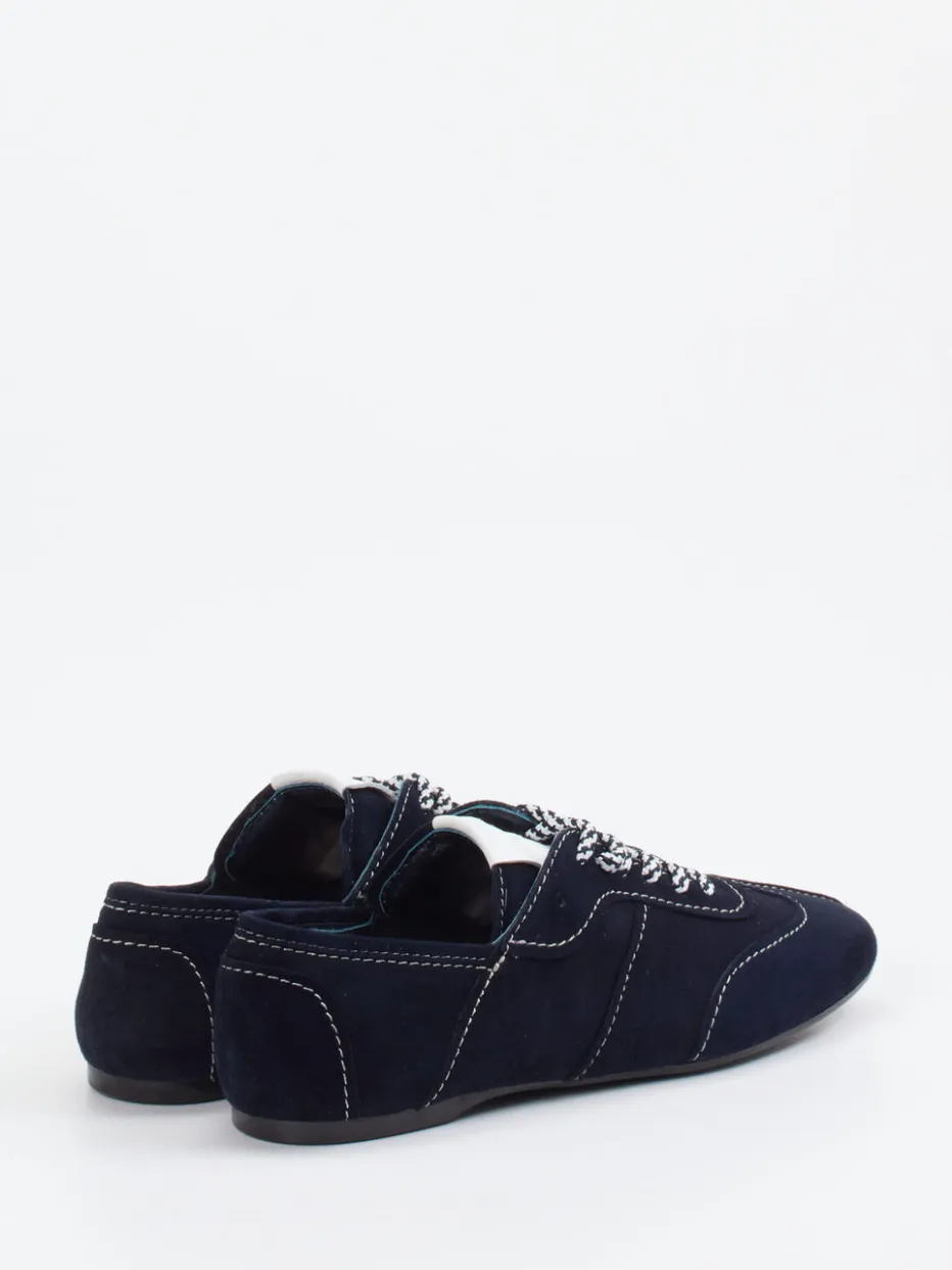 Minimalismus trifft Retro-Stil.Die Marke Konstantin Starke präsentiert mit diesem Sneaker ein modisch zurückhaltendes Modell für Alltag und Büro. Design und Funktion verbinden sich hier in einem schmal geschnittenen Casual-Sneaker aus feinsamtigem Veloursleder in Dunkelblau. Weiße Kontrastnähte und zweifarbige Schnürsenkel setzen dezente visuelle Akzente, während die schwarz profilierte Gummisohle sicheren Halt bietet. Die gepolsterte Ferse, das hochwertige Kalblederfutter und die flache Form sorgen für Komfort im urbanen Alltag. Inspiriert vom „Quiet Luxury“-Trend zeigt sich diese Silhouette zeitlos mit Anleihen aus der Retro-Sportswear. Ein vielseitiger Klassiker mit subtiler Designkompetenz von Konstantin Starke.
