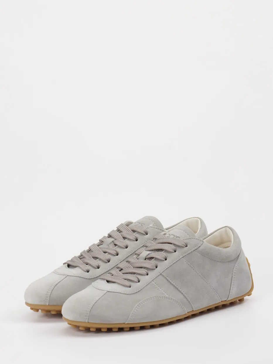 Feinheit in jedem Schritt. Tod’s präsentiert mit diesem Sneaker ein Modell im Retro Runner-Stil. Für entspannte Tage oder stilvolle Freizeitoutfits bietet dieser flach geschnittene Sneaker aus weichem Veloursleder hohen Tragekomfort. Das hellgraue Obermaterial mit matter Oberfläche wird durch tonale Nähte und eine dezente Logo-Prägung auf der Zunge veredelt. Eine profilierte Gummisohle mit Noppenstruktur sorgt nicht nur für sicheren Halt, sondern verleiht dem Modell seine charakteristische Optik. Sein minimalistischer Look mit 90er-Jahre-Akzent trifft den aktuellen „Quiet Luxury“-Trend. Ideal kombinierbar mit legerer Stoffhose oder monochromen Casual-Stücken. Ein dezenter Luxus-Sneaker mit markentypischer Handwerkskunst von Tod’s.