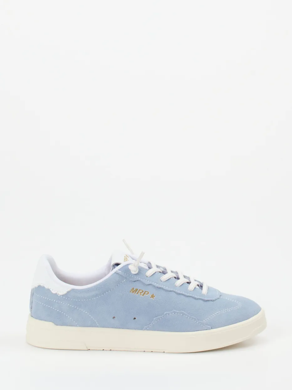 Pastell trifft Retro-Court.Der Sneaker von MRP begeistert als stilvoller Low-Top mit sportlich-reduzierter Silhouette. Für Alltag, Urlaub oder Wochenend-Outfits bietet das Modell einen komfortablen Auftritt. Das samtig angeschliffene Veloursleder in Hellblau harmoniert mit weißem Fersenbesatz und cremefarbener Gummisohle. Goldfarbener Logo-Print und Zickzack-Ziernähte setzen dezente Retro-Highlights. Ein feines Textilfutter sowie eine Einlegesohlenfreundlichkeit sorgen für zusätzlichen Tragekomfort. Inspiriert von Streetwear und Retro-Court-Sneakern der SS25-Saison. Für pastellfarbene Hoodie-Looks oder lässige Chinos gemacht – mit Leichtigkeit und Stil von MRP.