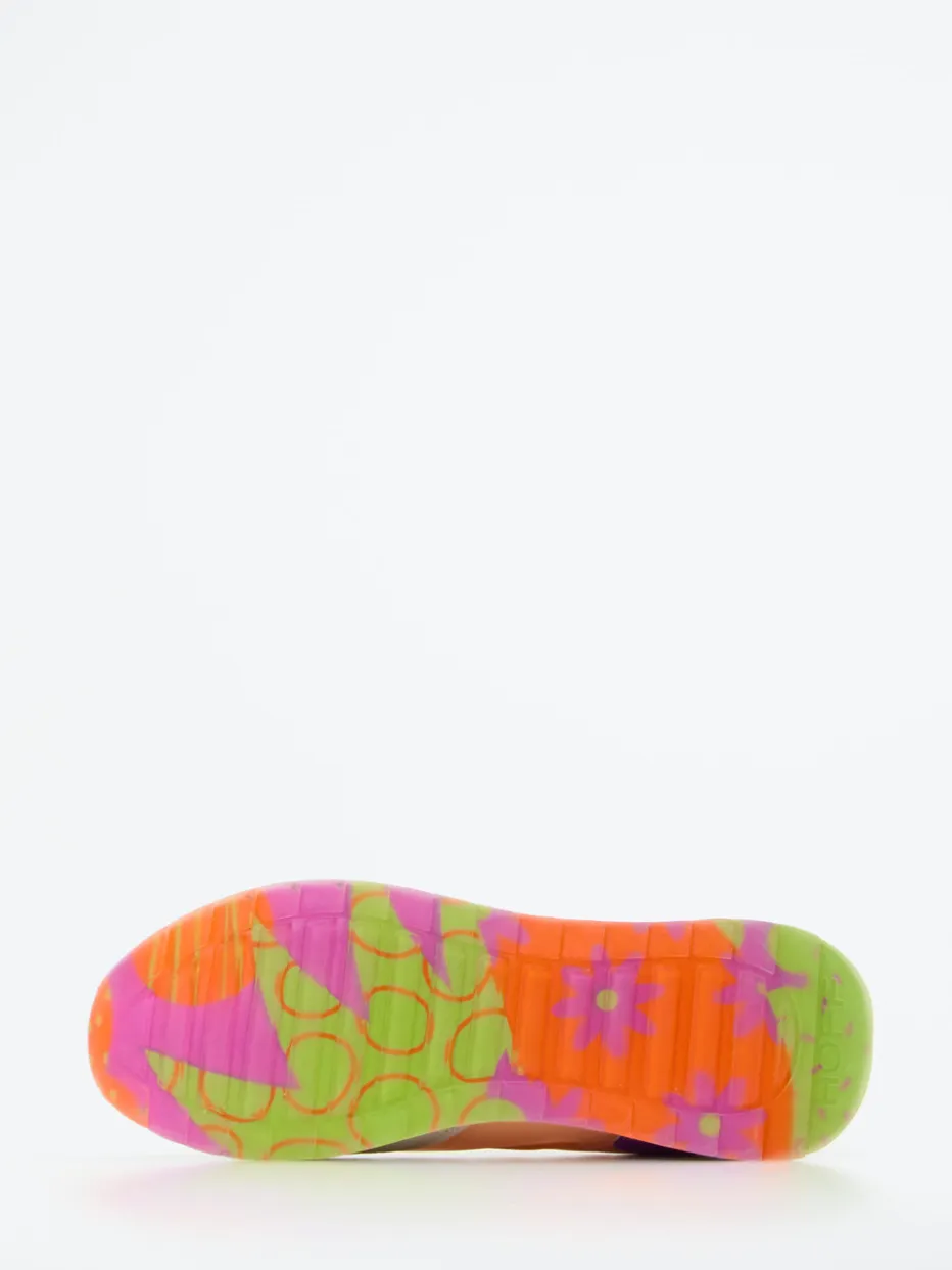 Farbexplosion im Retro-Look.THE HOFF BRAND interpretiert den klassischen Retro-Sneaker neu. Für ausdrucksstarke Alltags-Looks oder urbane Urlaubs-Outfits verbindet dieses Modell samtig angeschliffenes Veloursleder mit atmungsaktivem Mesh, Metallic-Elementen und kontrastierenden Neonakzenten. Pfirsichorange, Lila und Neongrün treffen auf eine durchsichtige Profilsohle mit floralem Muster – ein ungewöhnlicher Blickfang. Die klassische, niedrig geschnittene Silhouette mit gepolstertem Schaft und Memory-Foam-Fußbett sorgt für ganztägigen Komfort. Inspiriert vom Y2K-Trend ist dieser Schuh ein Must-have für trendorientierte Streetwear. Ein visuelles Statement mit hohem Tragekomfort und gestalterischer Raffinesse.
