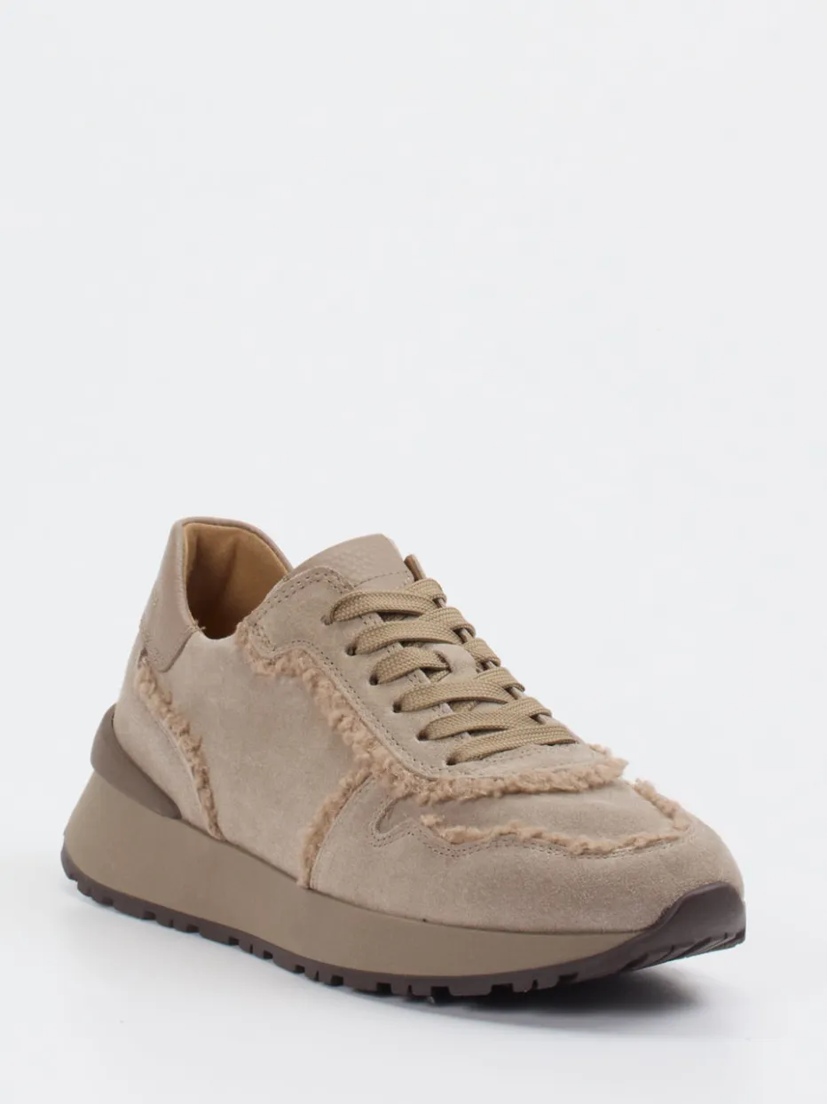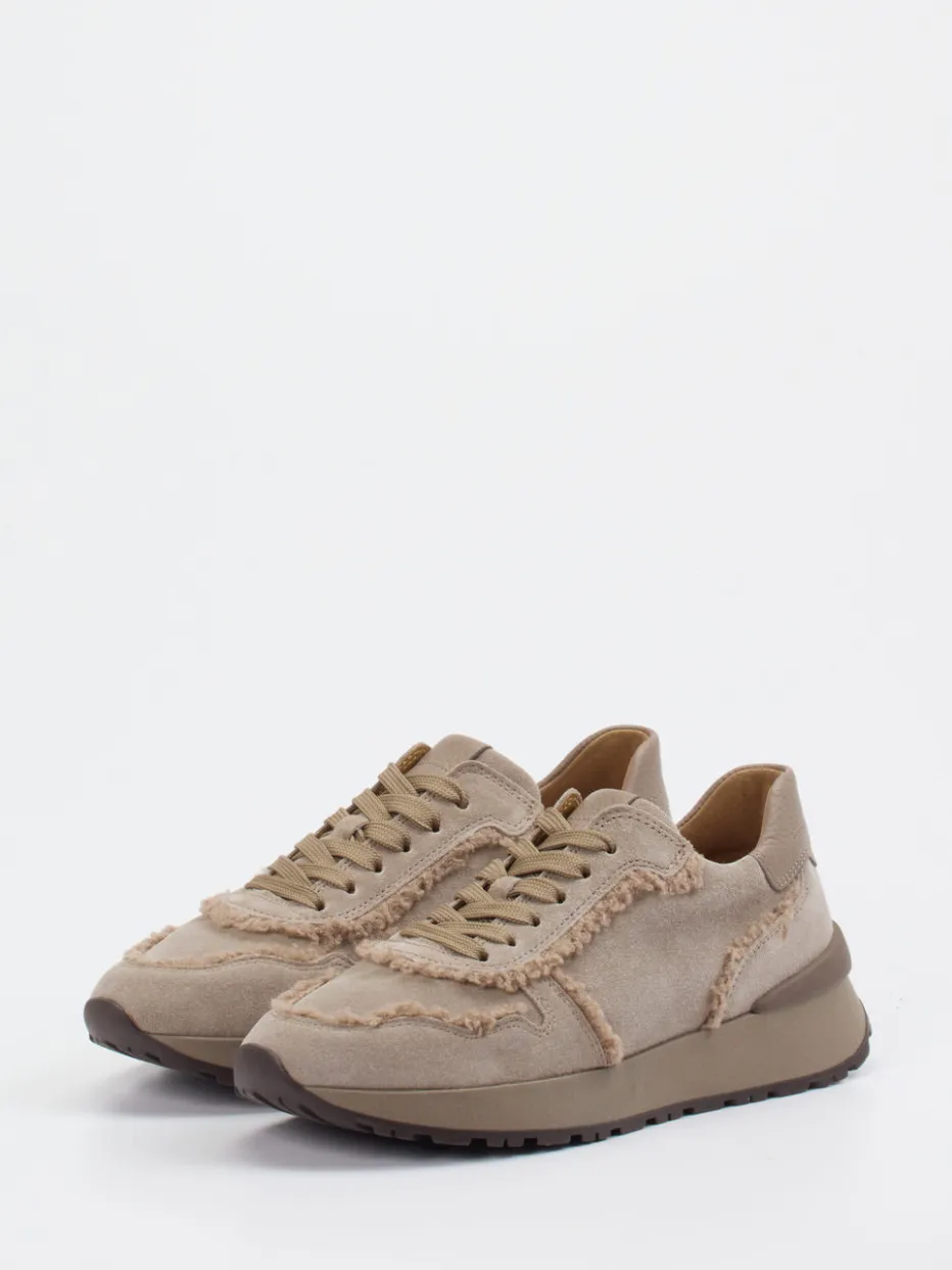 Für entspannte Spaziergänge oder gemütliche City-Tage: Dieser Low-Top-Sneaker aus Veloursleder, samtig angeschliffen, vereint eine beigegraue Ton-in-Ton-Optik mit abgerundeter Silhouette. Teddyfellartige Kanten und ein gepolsterter Fersenbereich sorgen für Wohlfühlcharakter, während die profilierte Gummisohle zuverlässige Trittsicherheit bietet. Farblich dezent gehalten, fügt sich das Modell nahtlos in monochrome Herbst-Looks ein. Ideal zu Steppjacken und Hosen in Naturtönen.