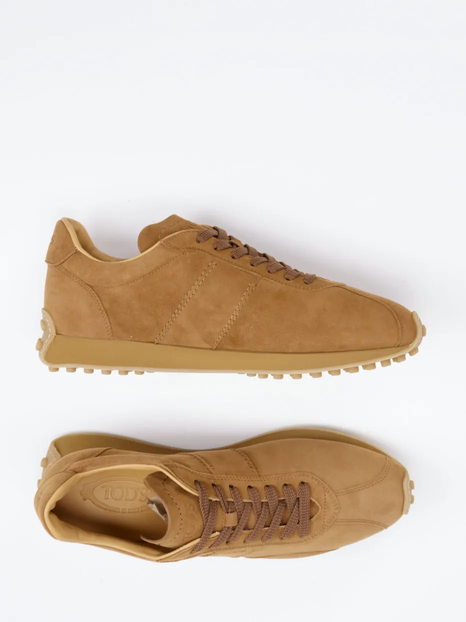 Eleganz im minimalistischen Retro-Look.Tod’s bringt mit diesem Herren-Sneaker klassischen Stil in moderner Interpretation. Ob beim Stadtspaziergang oder im Büroalltag – das cognacbraune Veloursleder mit matter Oberfläche sorgt für eine edle, zurückhaltende Optik. Tonale Nähte und das geprägte Logo an Zunge und Seite betonen die hochwertige Verarbeitung. Die klassische flache Silhouette mit gepolstertem Einstieg und ikonischer Noppensohle am Fersenbereich steht ganz im Zeichen dezenter Raffinesse. Der Look harmoniert ideal mit hellen Chinos oder einer Lederjacke in ähnlichem Ton. Ein Modell, das Quiet Luxury souverän und komfortabel verkörpert.