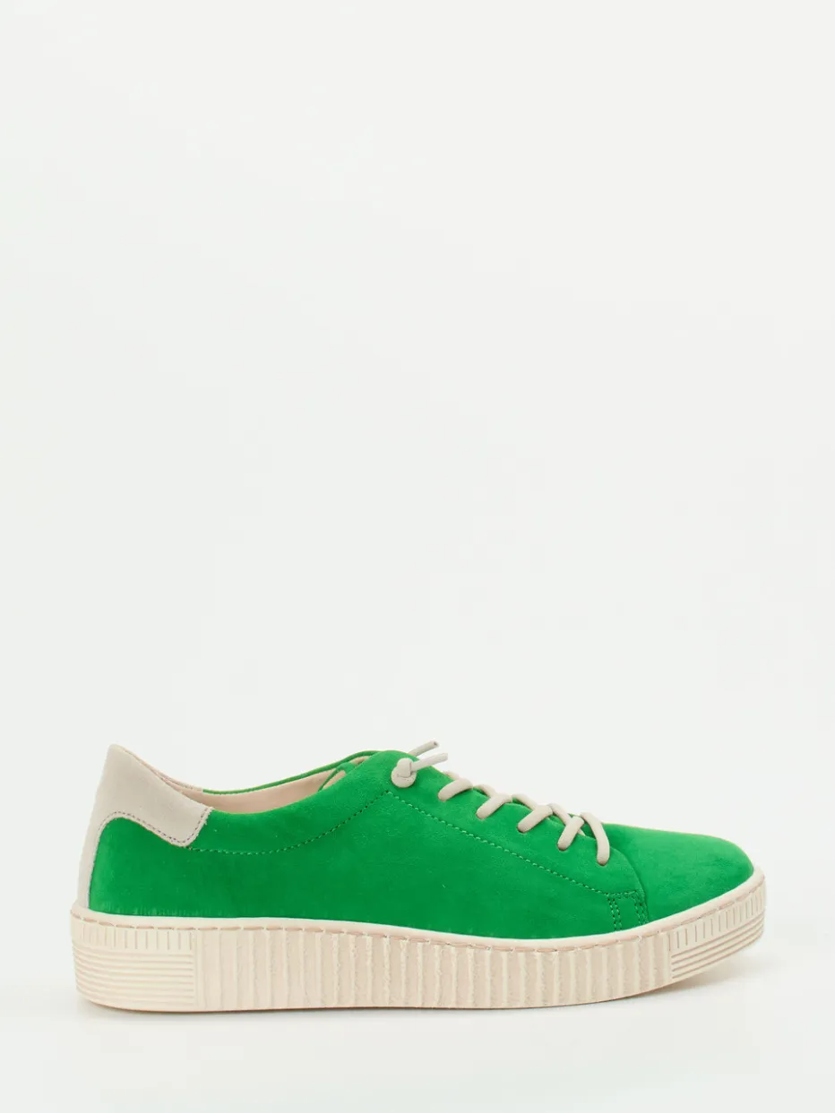 Sommerlicher Eyecatcher für den Alltag.Gabor präsentiert einen femininen Low-Top-Sneaker aus Veloursleder für entspannte Street-Looks. An sonnigen Tagen bringt der grasgrüne Farbton dieses Modells frische Impulse in urbane Outfits. Das samtig-matte Veloursleder überzeugt durch seine weiche Haptik, ergänzt um eine bequeme Plateaugummisohle mit Used-Finish. Tonale Nähte und ein beigefarbener Kontrastbesatz an der Ferse unterstreichen das minimalistische Design. Die profilierte Sohle bietet sicheren Halt, ein gepolstertes Wechselfußbett erhöht den Tragekomfort. Passend zum „Bold Colors“-Trend der Saison lässt sich dieser Sneaker besonders gut mit hellen Sommerjeans kombinieren. Gabor vereint modischen Anspruch mit funktionaler Leichtigkeit.