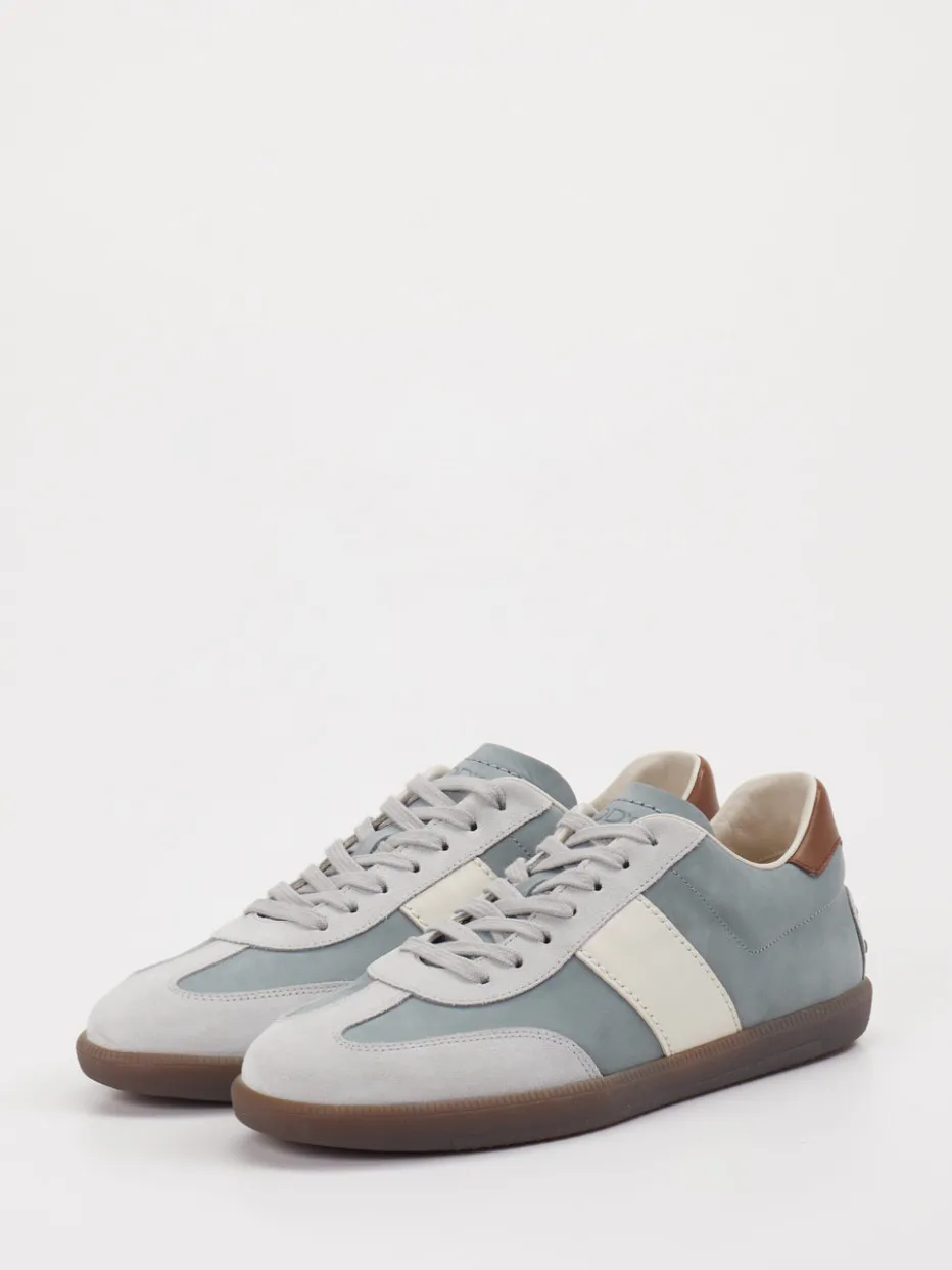 Smart Casual mit Retro-Flair. Tod’s präsentiert diesen Herren-Sneaker in klassischer Retro-Silhouette und dezenter Farbgebung. Ideal für Freizeitmomente mit Stilanspruch überzeugt das Modell mit einer Kombination aus glattem und Veloursleder. Die matte Oberfläche, das harmonische Blaugrau und kontrastierende Highlights wie der cognacfarbene Fersenbesatz unterstreichen die klare Linienführung. Eine flache, griffige Gummisohle und die weich gepolsterte Ferse sorgen für angenehmen Tragekomfort. Vom Vintage-Trend inspiriert, lässt sich dieser Sneaker vielseitig kombinieren – etwa mit schmal geschnittenen Chinos und Rucksack. Ein zeitgemäßer Klassiker für hochwertige Lässigkeit im Alltag.