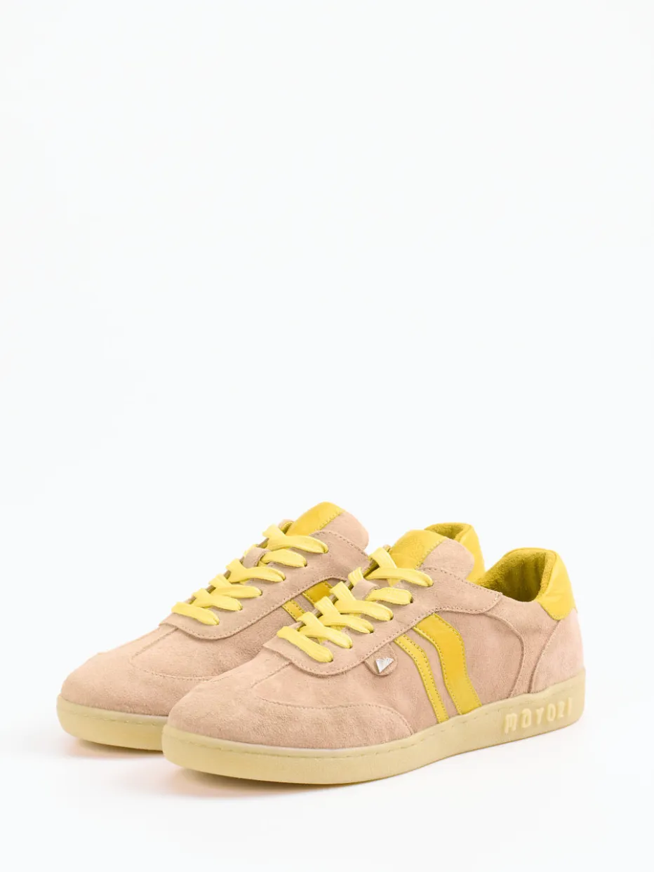 Retro-Charme für urbane Sommermomente.Mayori präsentiert einen unisex Low-Top-Sneaker im trendbetonten Streetwear-Stil. Für stilbewusste Freizeitmomente bietet das Modell ein samtig-weiches Veloursleder-Obermaterial in warmem Sandbeige. Kontrastdetails in leuchtendem Gelb, wie Streifenelemente und Fersenpartie, setzen farbstarke Retro-Akzente. Die runde Silhouette, ein symmetrischer Schnürverschluss und eine strukturierte Gummisohle vereinen Komfort mit sportlicher Ästhetik. Von Y2K beeinflusste Designansätze und Color-Blocking machen den Schuh zum idealen Begleiter für urbane Looks mit modischer Note. Kombinierbar zu Pastells oder monochromen Outfits. Ein markant urbanes Design mit ausdrucksstarkem Charakter – typisch Mayori.