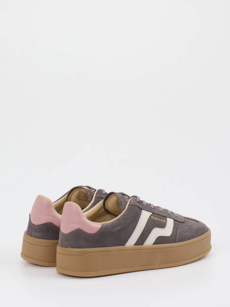 Retro-Flair neu interpretiert.Gant setzt bei diesem Damen-Sneaker auf eine stilvolle Kombination aus Minimalismus und Sportswear-Ästhetik. Ideal für entspannte Tage im Alltag überzeugt das Modell durch samtig angeschliffenes Veloursleder in Schlammgrau und kontrastierende Designelemente: ein roséfarbener Fersenbesatz, cremeweiße Seitenstreifen und ein goldfarbener Logo-Print setzen visuelle Akzente. Die strukturierte Gummisohle im angesagten Plateau-Look unterstreicht den Retro-Charme. Dank klassisch-runder Silhouette und komfortabler Innenausstattung ist der Sneaker perfekt für Freizeit und Reisen geeignet. Besonders stimmig wirkt er zu hellen Denim-Looks und naturfarbenen Accessoires. Ein Statement-Modell mit femininer Note und markentypischem Qualitätsanspruch.