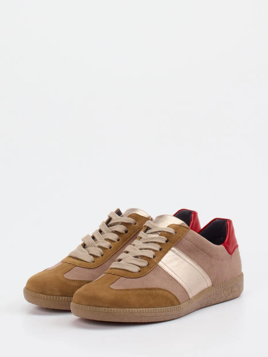 Komfort trifft auf Retro-Metallic.Der Damen-Sneaker von Semler vereint sportliches Design mit modischer Raffinesse. Für stilvolle Alltagsmomente konzipiert, überzeugt dieser Low-Top-Sneaker durch taupefarbenes Veloursleder, ergänzt durch cognacbraune und rot glänzende Glattleder-Akzente. Der goldmetallic-schimmernde Einsatz unterstreicht die ruhige Silhouette mit einem ausdrucksstarken Twist. Eine profilierte Gummisohle sorgt für zuverlässigen Halt, die praktische Schnürung für individuellen Sitz. Inspiriert von Retro-Sportswear und Minimalismus, fügt sich das Modell harmonisch in herbstliche Freizeitlooks. Besonders stimmig in Kombination mit cognacfarbenen Steppjacken oder Taschen im selben Farbspiel. Semler steht für erstklassige Passform und handwerkliche Qualität im Casual-Segment.