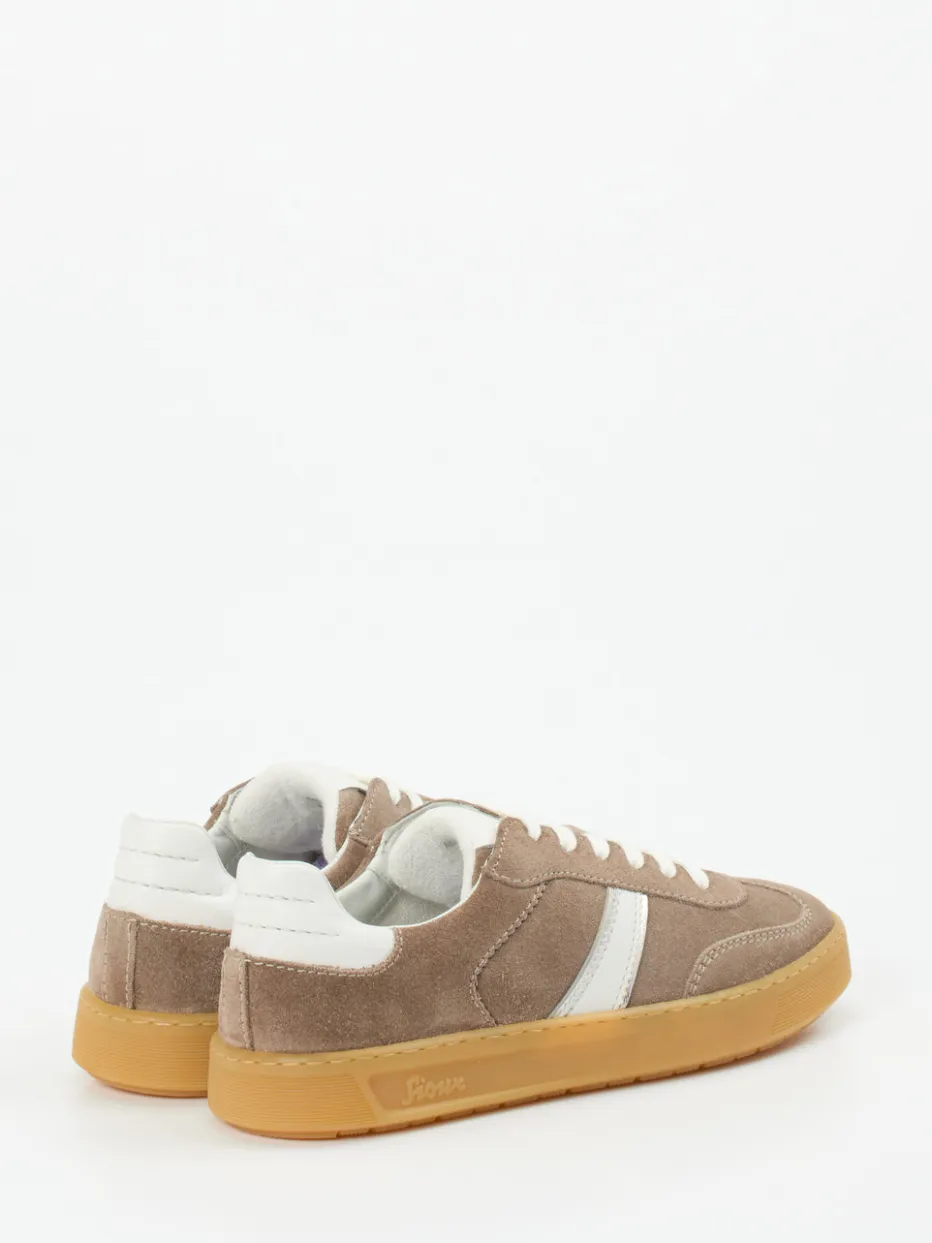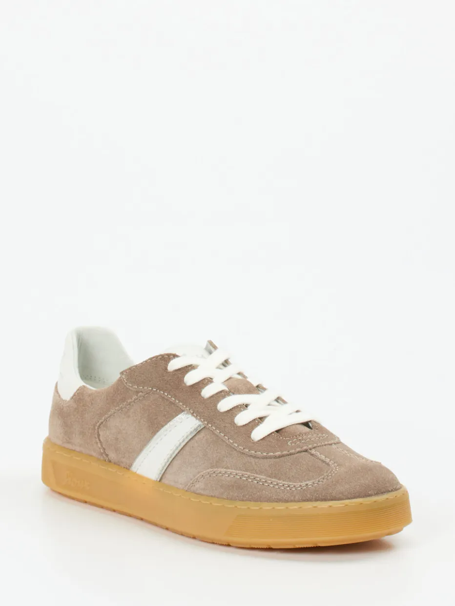 Gefertigt aus taupefarbenem Veloursleder mit samtig-matter Oberfläche und tonalen Ziernähten. Weiße Kontrastriegel an Ferse und Schnürung setzen gezielte Akzente, während die honiggelbe Gummisohle mit Profil die sportliche Linie aufgreift. Die klassische, flache Silhouette unterstreicht den Vintage-inspirierten Streetwear-Charakter. Dank weich gepolsterter, herausnehmbarer Innensohle und atmungsaktivem Textilfutter entsteht ein hohes Maß an Komfort. Lässt sich casual mit Chino oder Denim kombinieren.